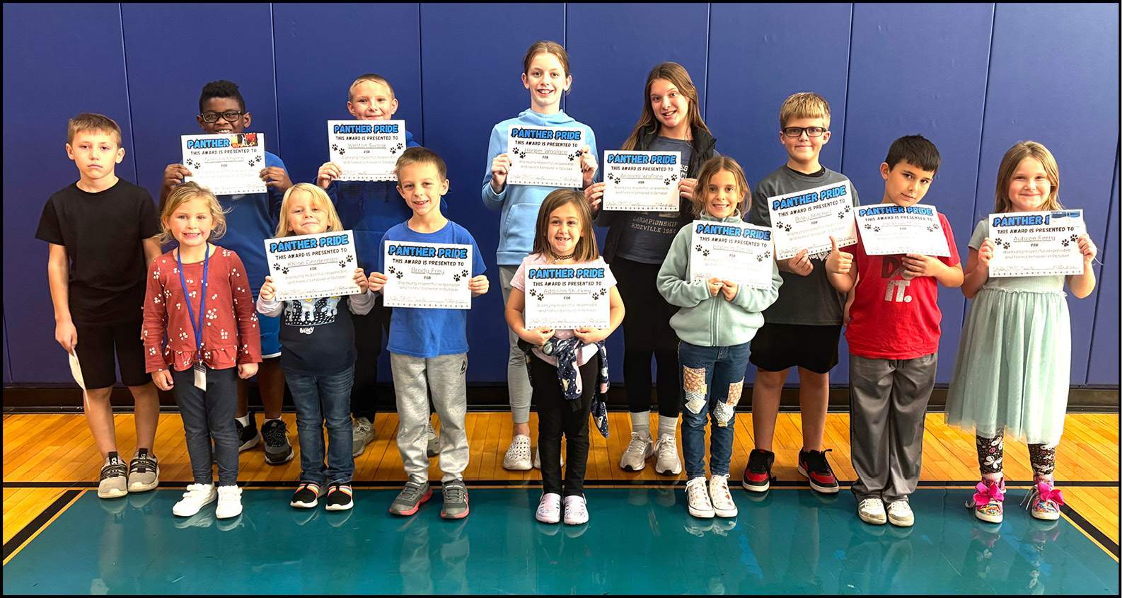 OCTOBER WINNERS … Front Row: L-R: Leah Ruffer, Khloe Gerdeman, Brody Frey, Addison STukey, Isabella Dallas, Jackson Miller, Aubree Ferry. Back Row L-R: Kaiden Mohr, Graisen Martin, Weston Swank, Harper Woolace, Arianna Wallace, Riley Mitchell. Missing: Jack Froelich.