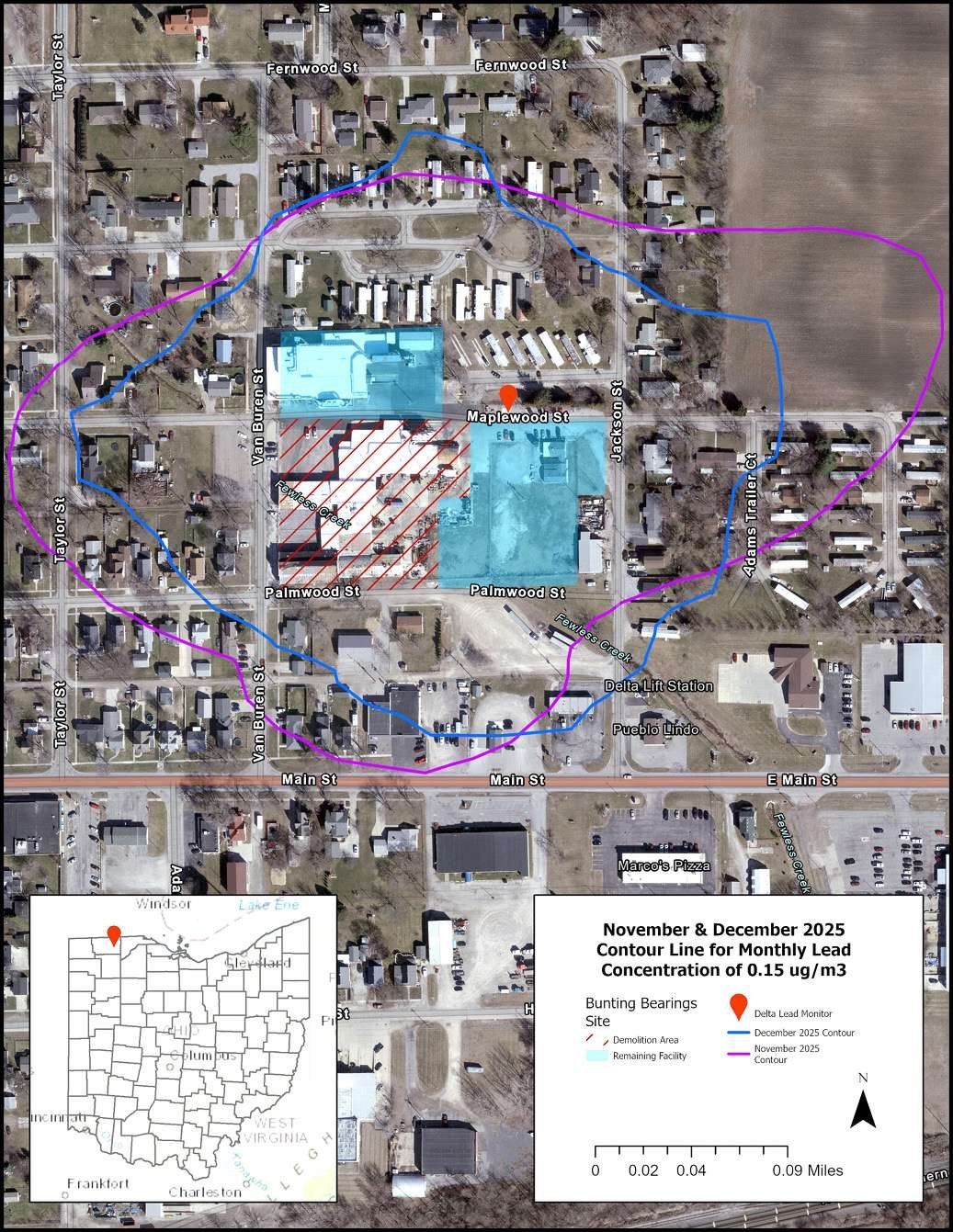 DELTA LEAD IMPACT AREA … A map released by the Ohio Environmental Protection Agency delineates the area estimated to be impacted the most by lead dust contamination from demolition of the Bunting Bearings property in Delta, shown at the center. The blue outline shows the area most impacted in December, with the area of greatest impact in November is outlined in purple. The location of the lead monitor is indicated in red.