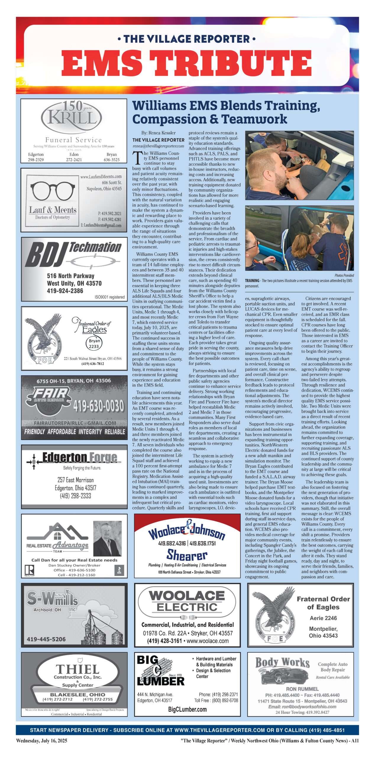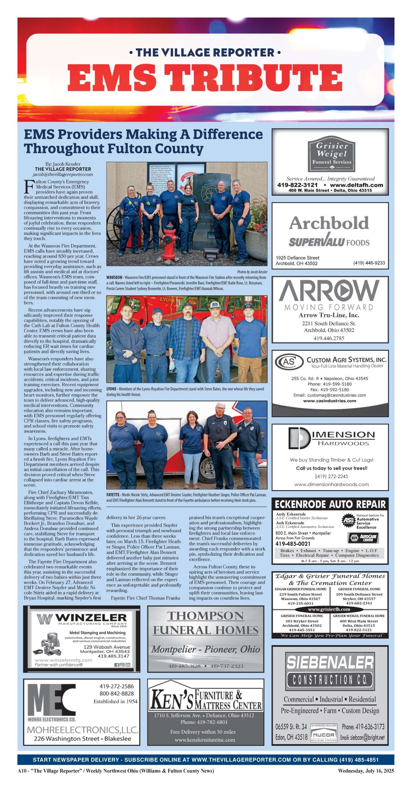 This week’s feature in The Village Reporter spotlights the extraordinary dedication and teamwork of EMS providers across Fulton and Williams counties. From lifesaving rescues and rapid responses to community outreach and advanced training, these first responders go above and beyond to protect and serve local residents. Their compassion, skill, and commitment shine through every call—making a real difference in the lives of those they help.