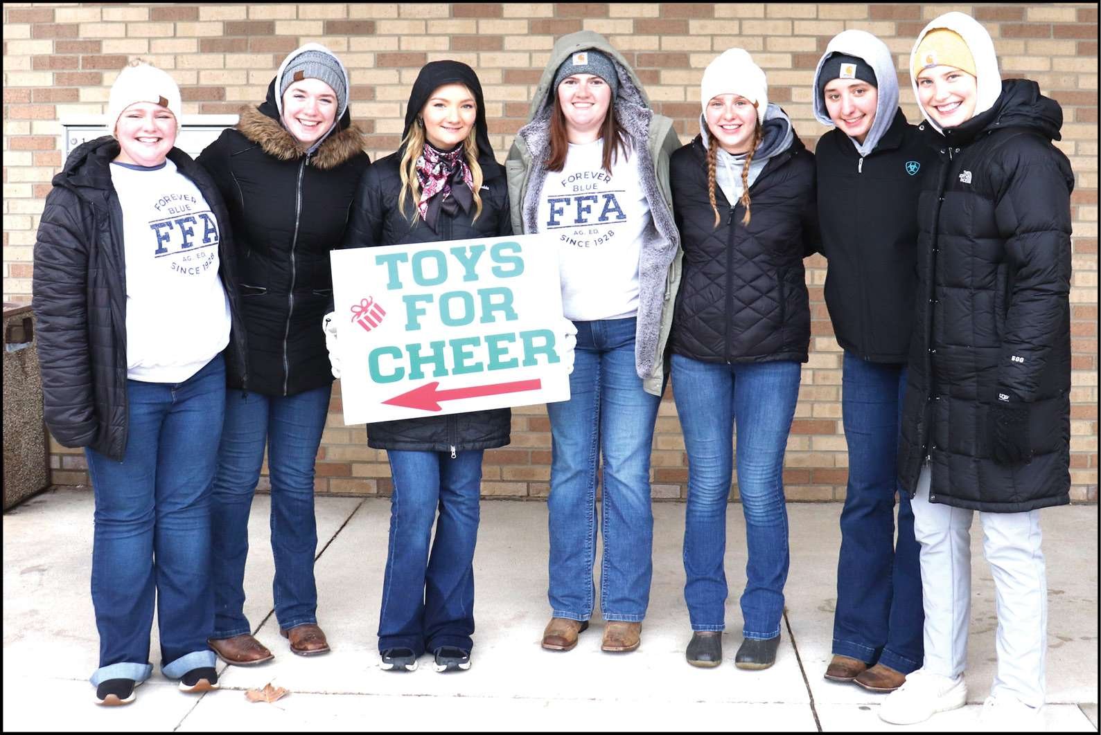FULTON COUNTY CHRISTMAS CHEER … On November 22, seven Pettisville FFA members volunteered at Fulton County Christmas Cheer. Members advertised with signs, collected donations, and helped with the donation meal. From left: Olivia Beck, Noelle Fox, Ava Genter, Katie Moore, Genevieve Galvin, Courtney Wiemken, and Olivia Miller.