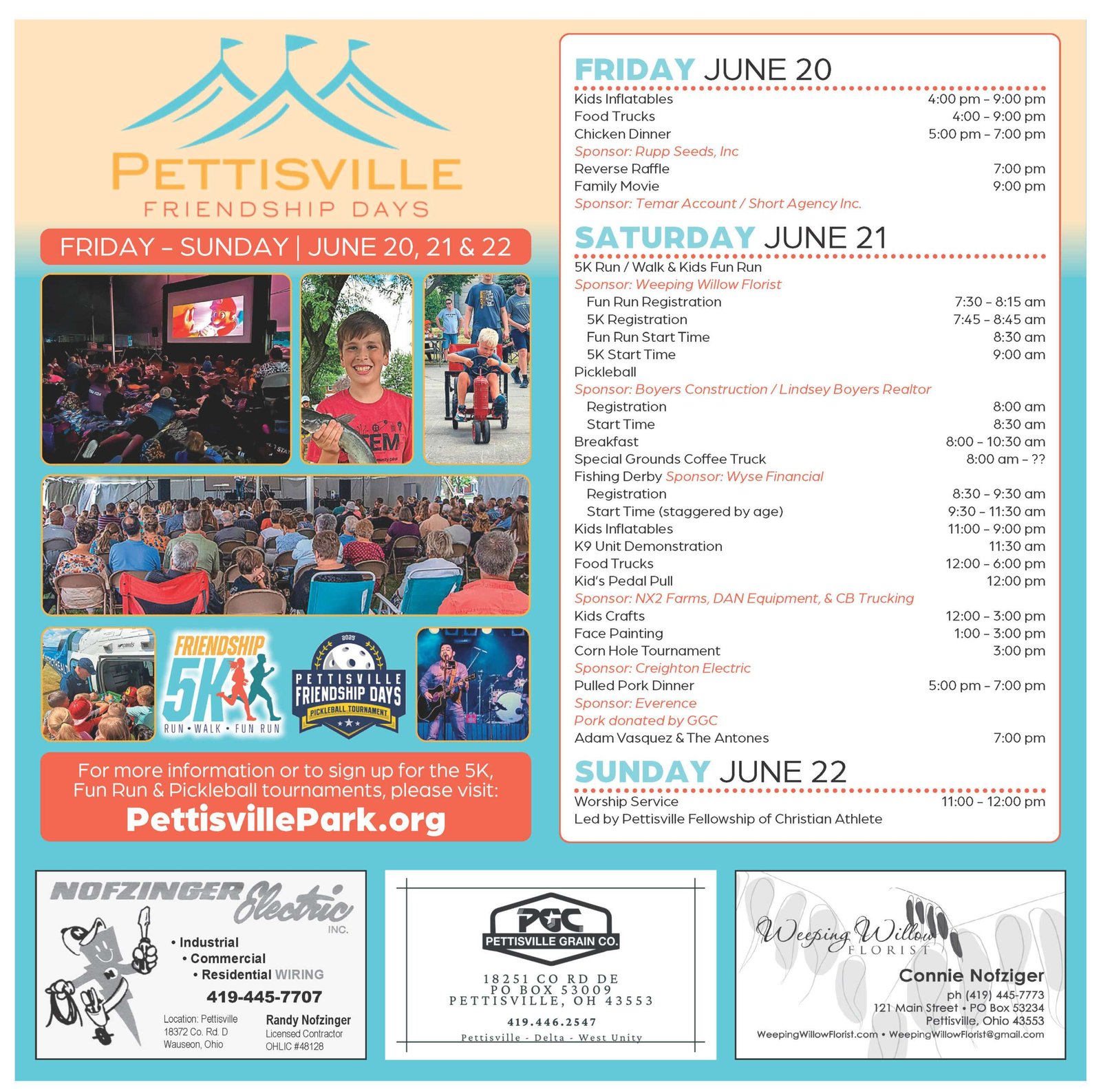 Join the Pettisville Friendship Days from June 20-22, featuring fun activities like a 5K run, food trucks, kids’ inflatables, and live entertainment! #PettisvilleFriendshipDays