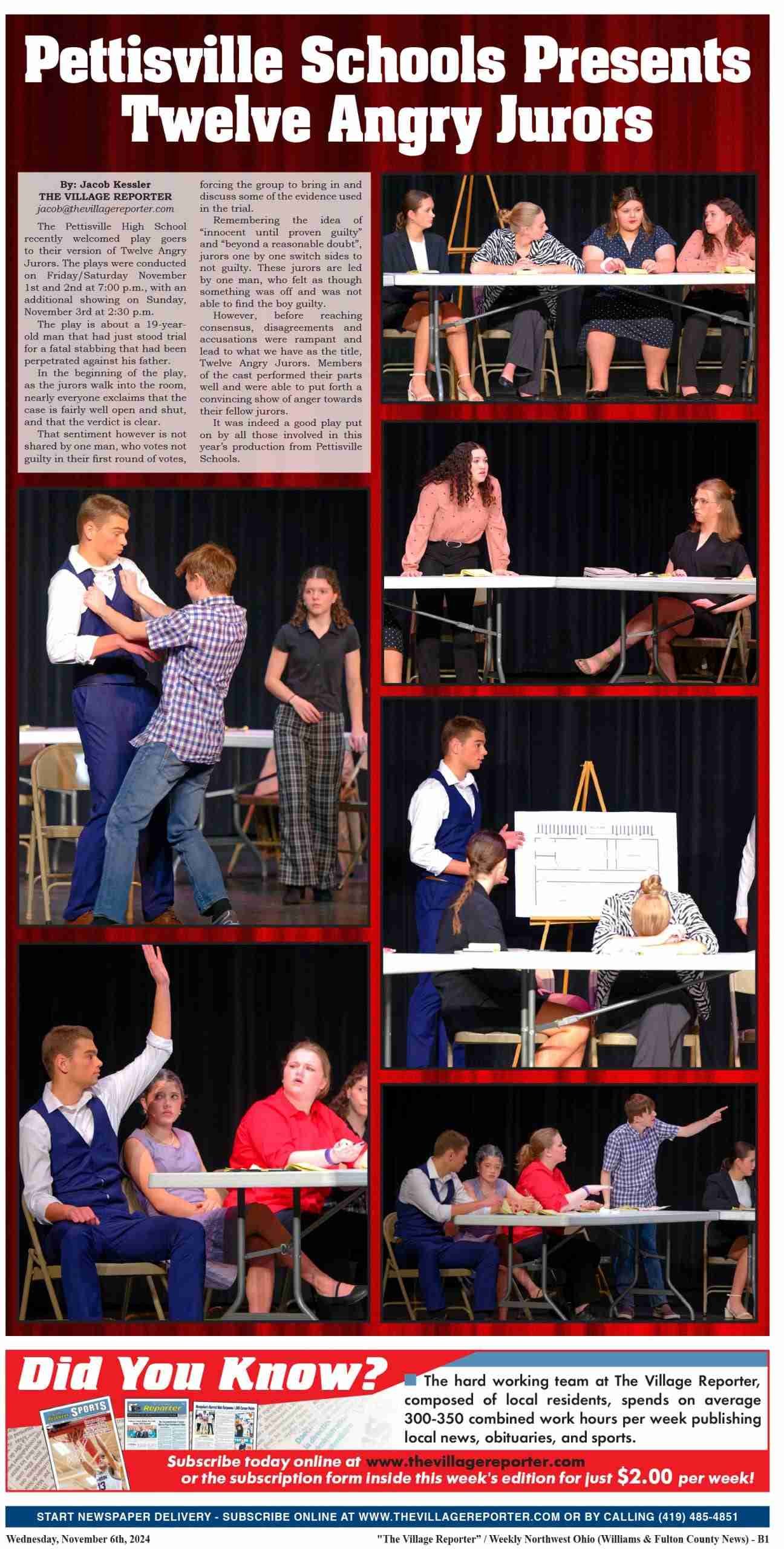The Pettisville High School recently welcomed play goers to their version of Twelve Angry Jurors. The plays were conducted on Friday/Saturday November 1st and 2nd at 7:00 p.m., with an additional showing on Sunday, November 3rd at 2:30 p.m.