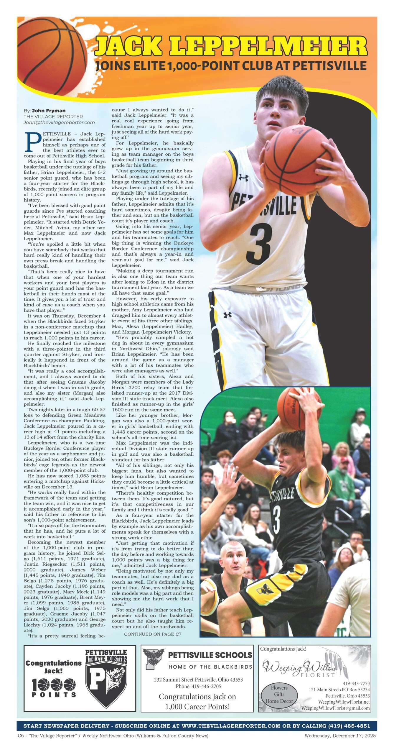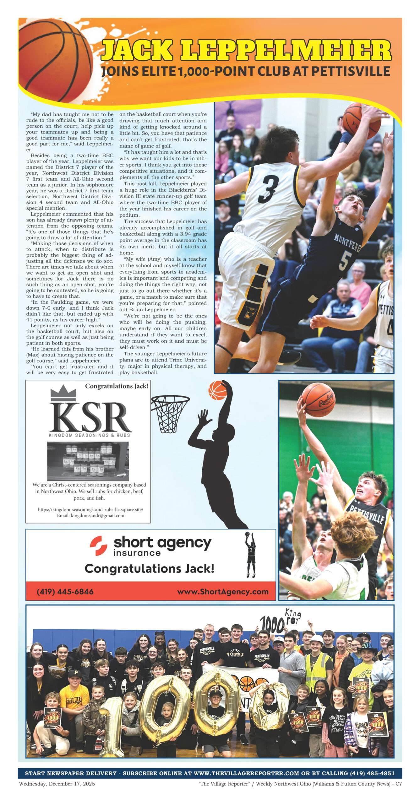 Congratulations to Pettisville’s Jack Leppelmeier on joining the elite 1,000-point club—he hit the milestone on Dec. 4 vs. Stryker and then exploded for a career-high 41 points two nights later against Paulding.