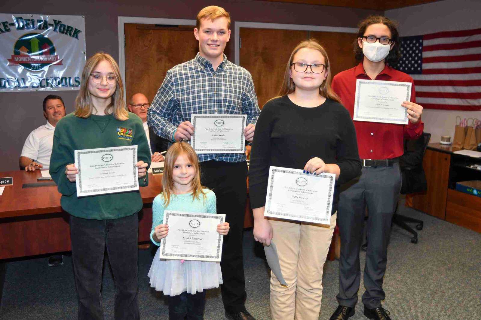 The students that were recognized are as follows.First grader Kendel Beachner, fifth grader Willa Rosene, ninth grader Walter Hallet, 12th grader Elixah Bustamante, and eleventh grader Savannah Schaller.