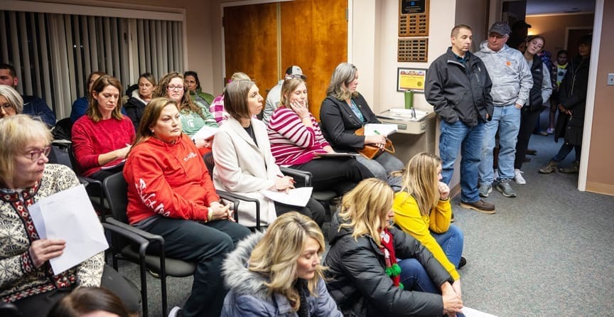 CROWDED ROOM … Members of the public stand crowded in the Delta School Board Office during the meeting on December 21st. (PHOTO BY JACOB KESSLER, STAFF)