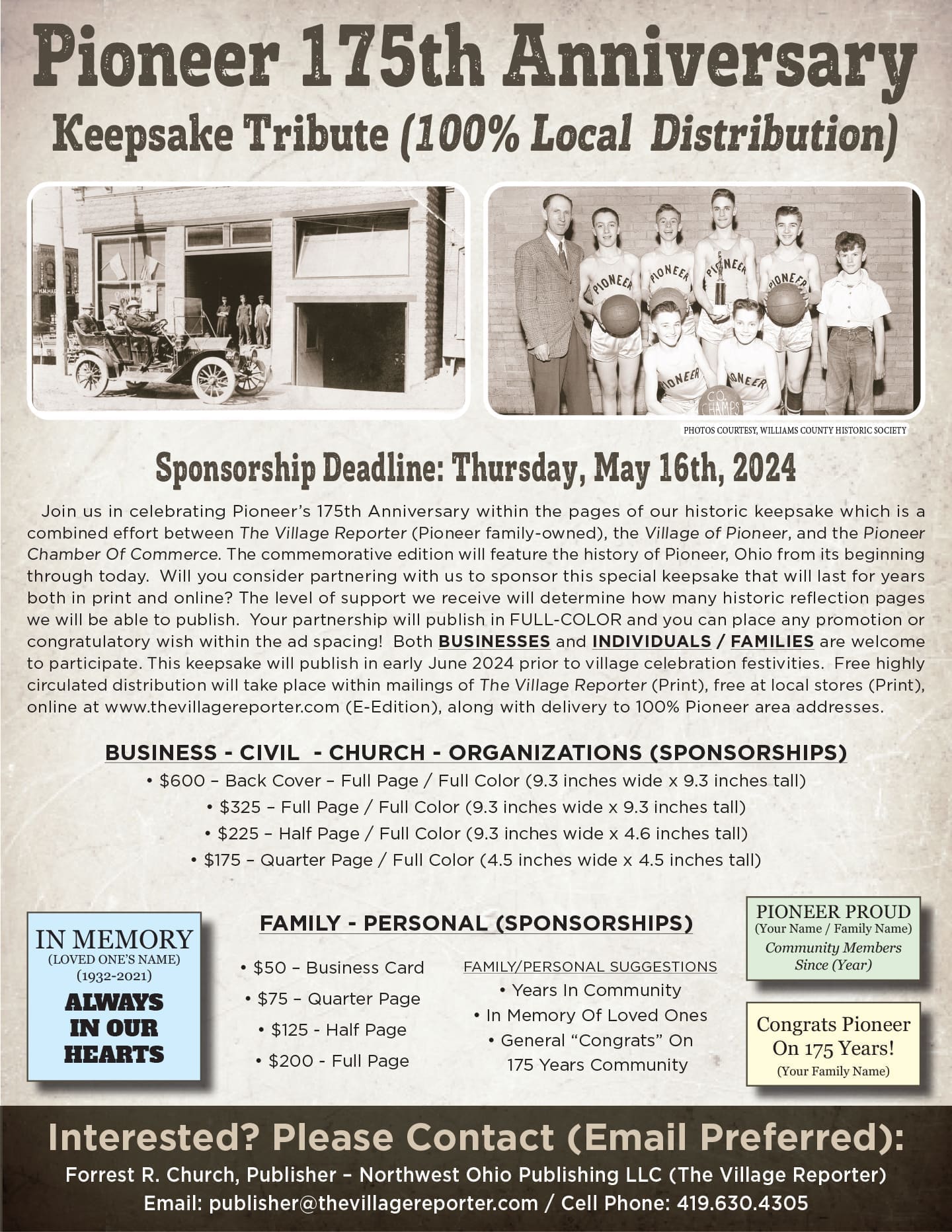 Whether you are a local business, church, organization, family or private citizen you are invited to participate in the historic keepsake that will be a focal point this the 175th anniversary celebration in early June 2024. Details may be found in the flyer below that will also be mailed via the Post Office to all Pioneer addresses.