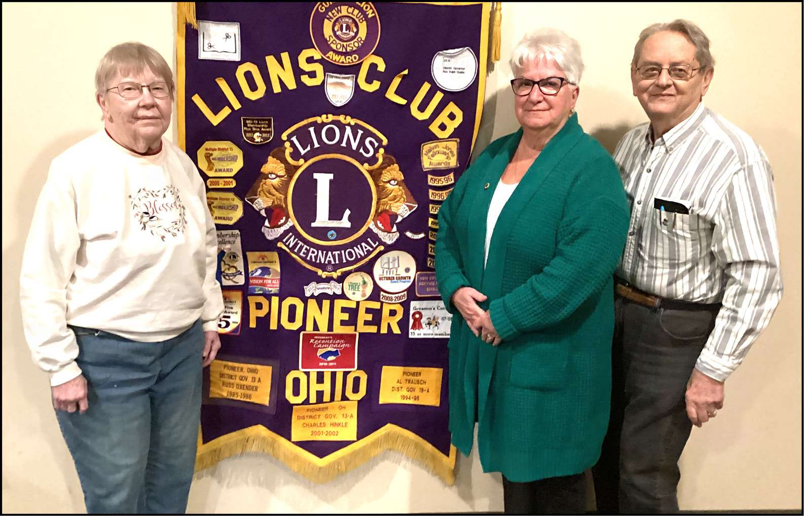 YEARS OF SERVICE … At their Monday, March 24th meeting, the Pioneer Area Lions Club welcomed ZC Jo Moats (center) and PDG John Moats (right). Lion Joan Trausch (left) was presented her 35th year membership pin. Thank you, Lion Joan, for your 35 years of service to Lionism.