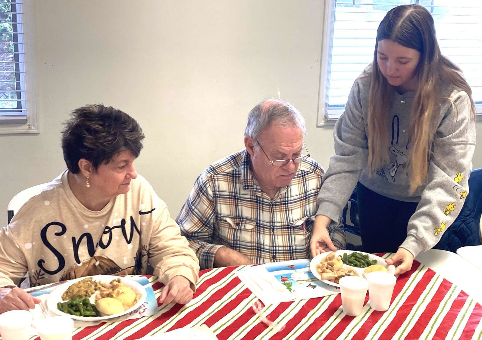 CHRISTMAS MEAL … The Village of Pioneer held its annual Christmas Luncheon for its senior citizens on Tuesday, December 9, at the Pioneer Community Center. National Honor Society members of North Central High School helped out by serving the Christmas lunch featuring turkey gravy, dressing, mashed potatoes, green beans, rolls, and pie provided by the Williams County Department of Aging. In the photo, Kaylee Mills (right) of the North Central National Honor Society serves lunch to Vicki Griceshouer (left) and Stevie Clay (middle).