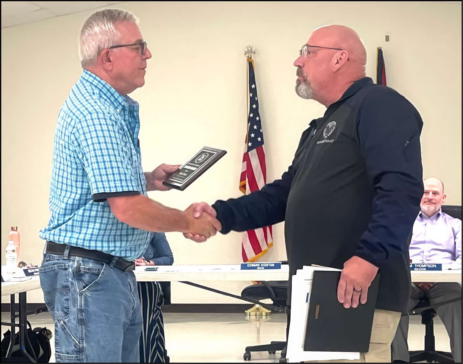 IN APPRECIATION … Police Chief Tim Livengood accepts a plaque on behalf of Lieutenant Jon Roberts, honoring Roberts for 15 years of service to the Pioneer Police Department.