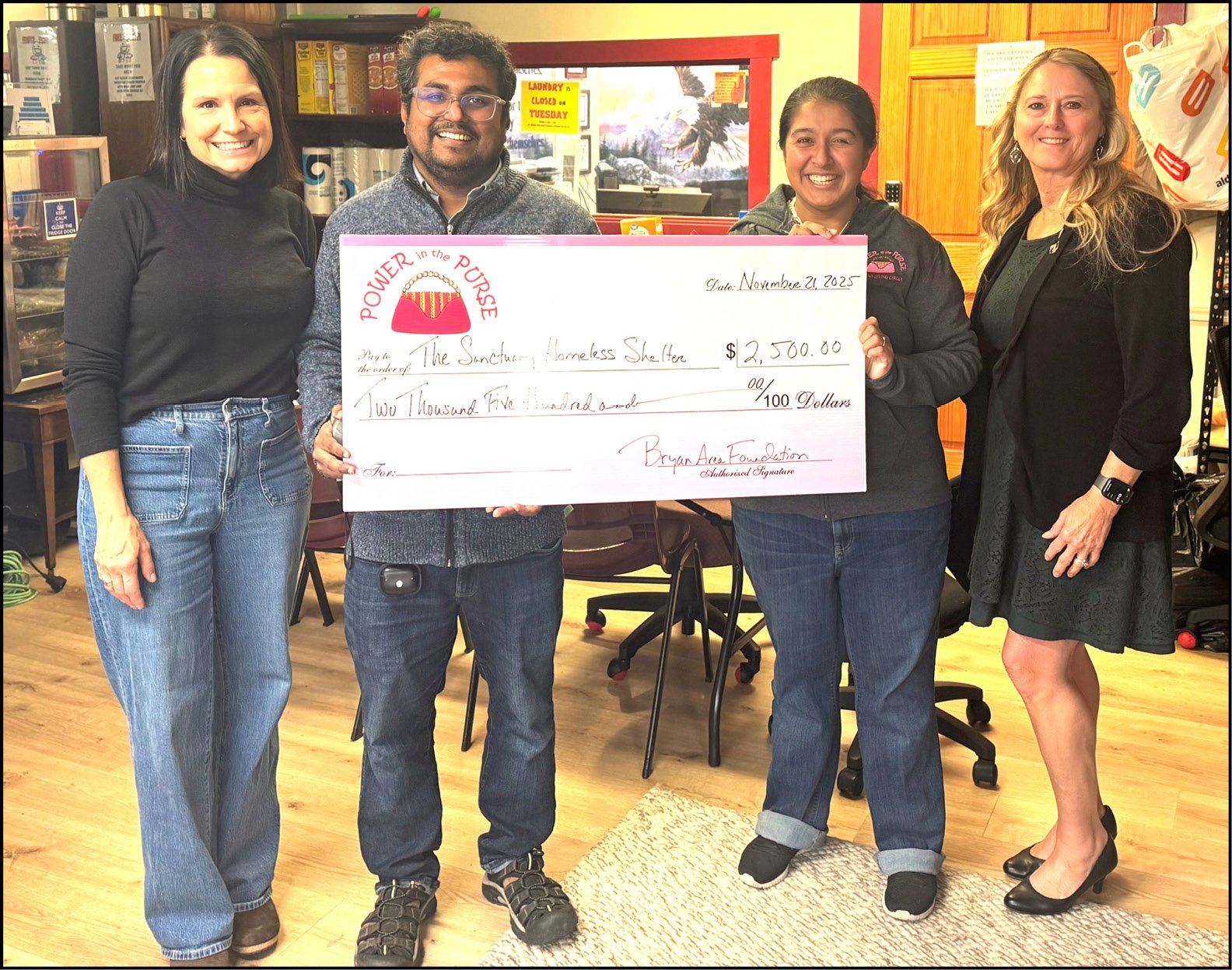 GRANT MONEY … At the Power in the Purse (PIP) women’s giving circle 10th Anniversary Celebration, members voted to award one of the 2025 non-winning, previously presented nominees from the first, second, third, and fourth quarter meetings, with a “second chance” $2,500 grant. Sanctuary Homeless Shelter was drawn from seven candidates and will use the money to rent two additional apartments, allowing it to provide shelter to even more clients. Pictured during the check presentation are PIP Publicity Director Karin Bowers, Sanctuary Homeless Shelter Director of Operations Sibin Sam, Sanctuary Homeless Shelter Director of Pastoral Care Pheba Sam, and PIP Chair Cheryl Andres.