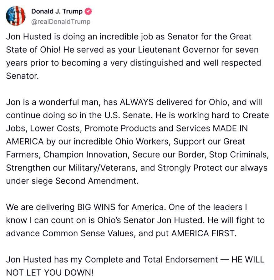 The endorsement from President Trump positions Husted as the frontrunner in the race for Ohio’s U.S. Senate seat. For more information about Jon Husted’s campaign, visit [JonHustedforSenate.com](https://JonHustedforSenate.com).