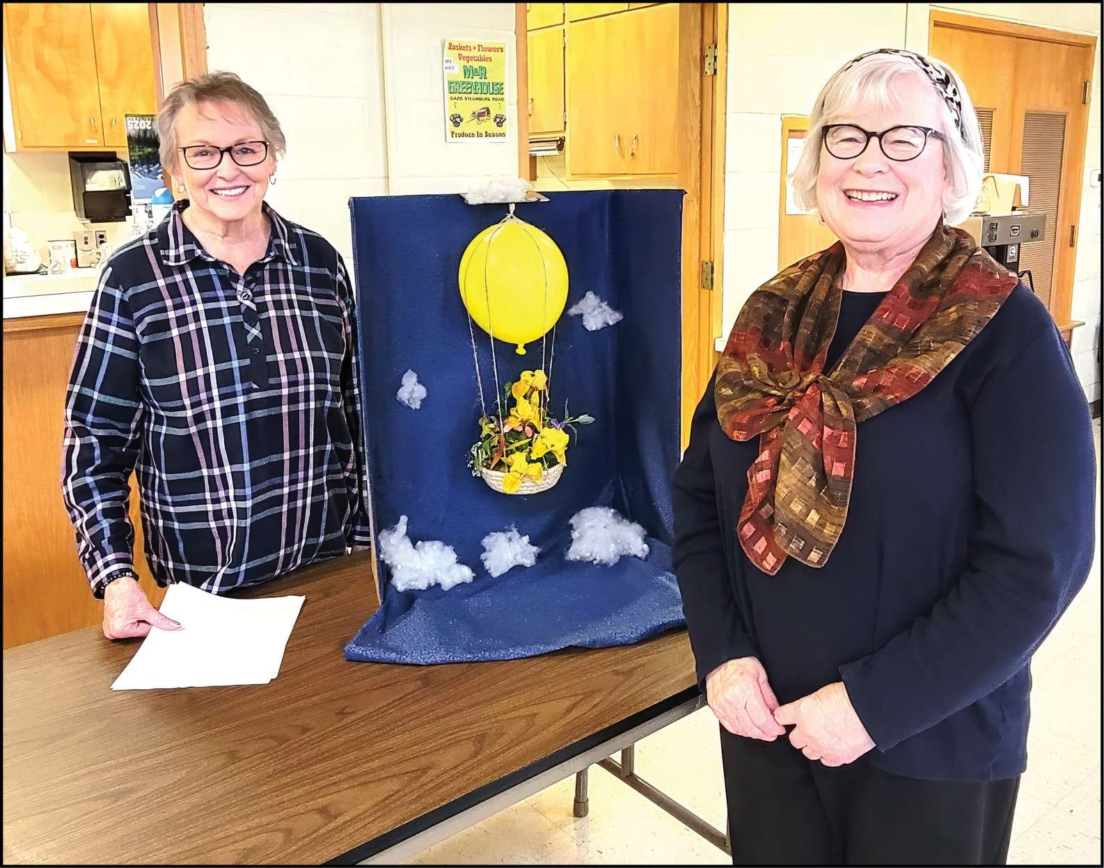 GARDENING LESSON … Pictured on the left is Kay Beck who presented a program on Vertical Gardening. On the right is Carol Wheeler with the arrangement of the month entitled “Up, Up and Away”.