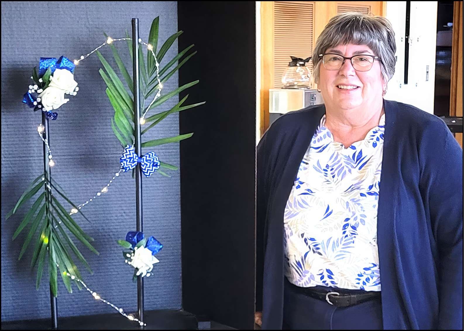 FLORAL DESIGN … Regina Partee is pictured with her creative floral design interpretation of the theme “School Days”. She entitled it “The Prom” and included a corsage, boutonniere, bowtie and tiny lights.
