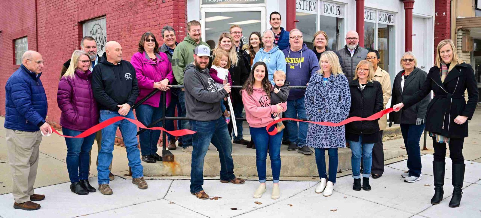 RIBBON CEREMONY … James and Kristin Sayers stand with members of the Wauseon Chamber of Commerce, friends and family, and local business owners as they cut the ribbon for the grand opening of their new store, Black Swamp Boots. (PHOTO BY JACOB KESSLER, STAFF)