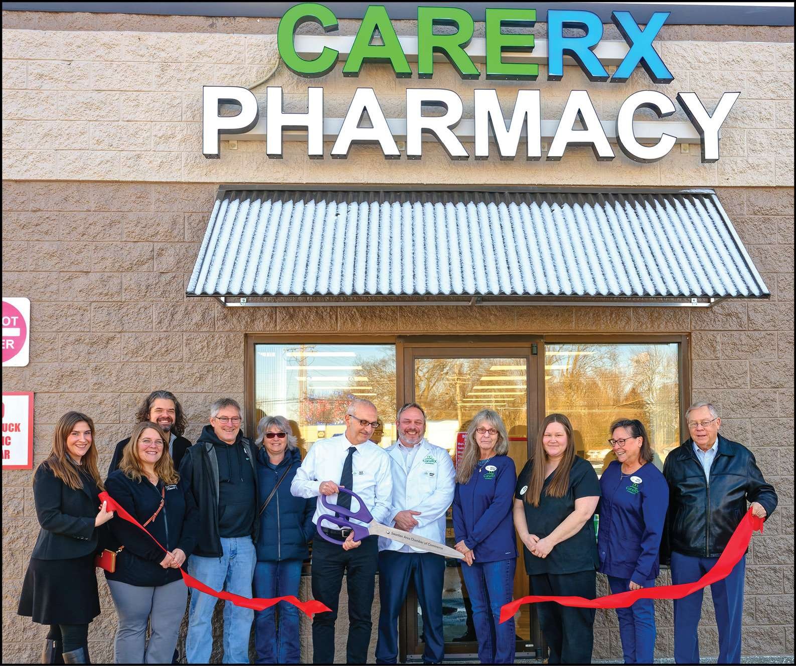 RIBBON CUTTING … CareRX Pharmacy owner Najib Mawad cuts the ceremonial ribbon in celebration of the opening of his new pharmacy. Standing with Mawad are employees, Swanton Chamber of Commerce members and Swanton Mayor Neil Toeppe.