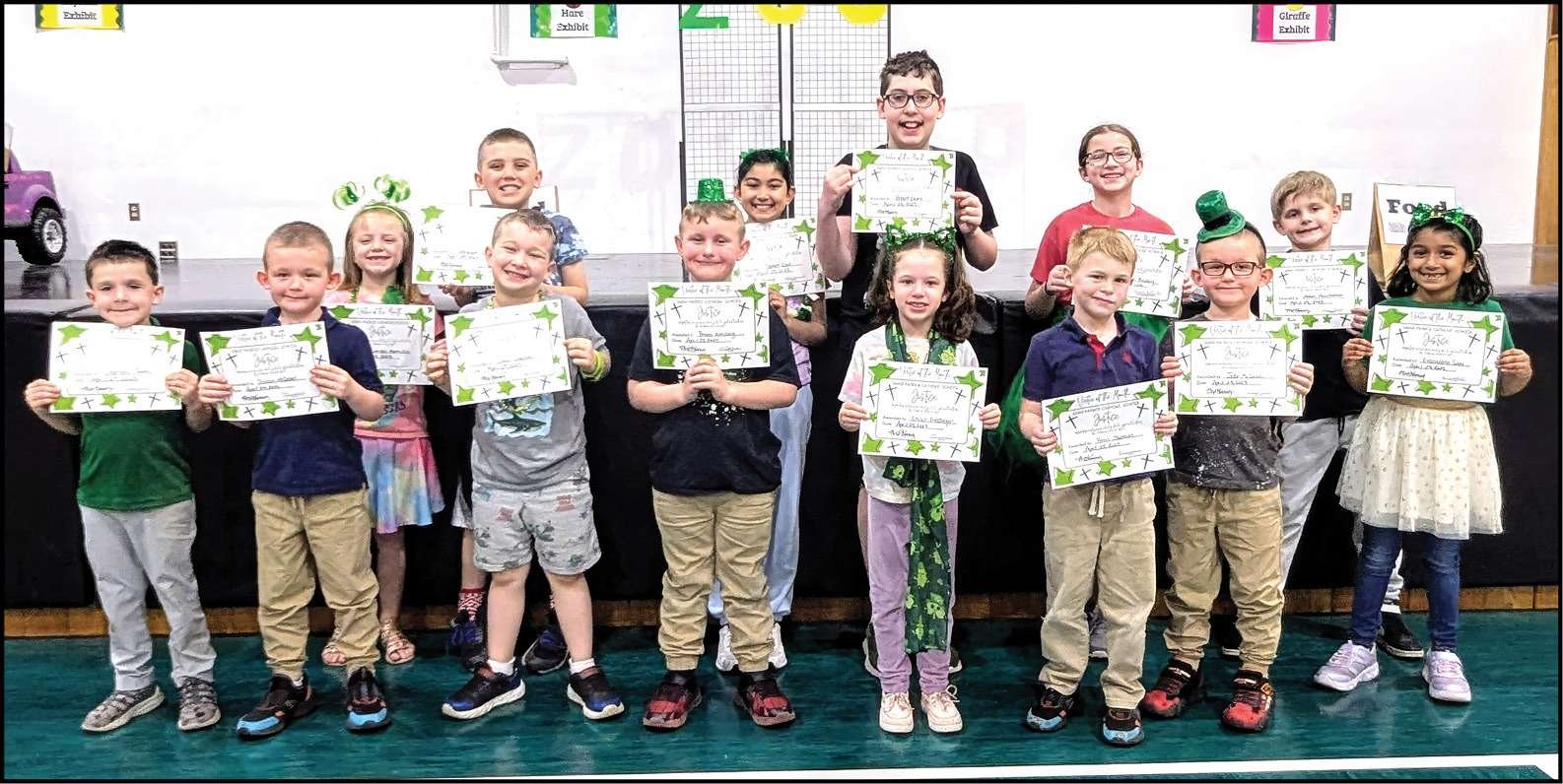STUDENTS HONORED … At the April Spirit Assembly, Saint Patrick Catholic School recognized its Justice Virtue Recipients. Individuals who act with justice truly understand the meaning of fairness and treat others with the kindness and love they deserve. The recipients are: back row (left to right) Lorelei Henricks, Abraham Johnston, Savreen Kaur, Wyatt Lauro, Lillian Rockey, and Asher Faulhaber; front row (left to right) Stanford Towne, Declan McDaniel, Simon Chappius, Brooks Keesbury, Emilyn Ernsberger, Ferrin Krukowski-Chapman, Jesse McDaniel, and Evageline Sam.