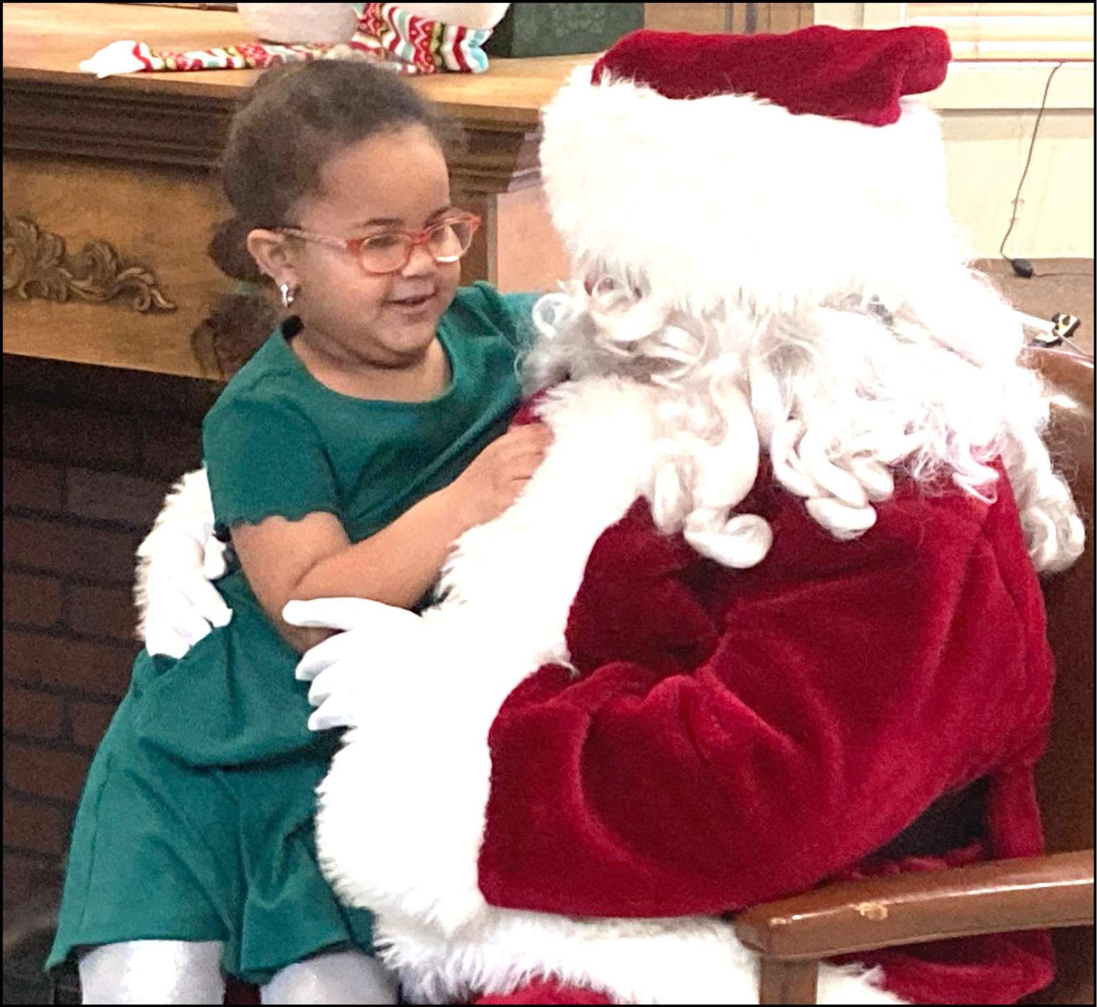 JOLLY OLD ST. NICK … Santa Claus made his annual yearly visit to the Pioneer American Legion Post 307 on Saturday, December 6 listening to all the boys and girls on what they want for Christmas. Pictured is five-year-old Eleanor Culbertson (above) sitting on Santa Claus’ lap telling him what she wishes for Christmas. In addition to Santa’s visit, a collection of non-perishable food items to help the village took place.