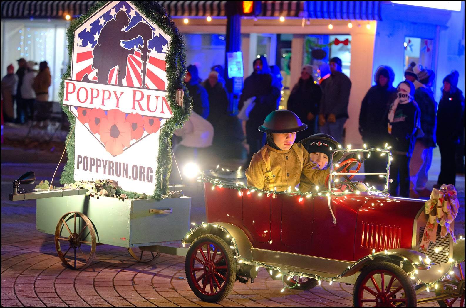 POPPY RUN … A vintage inspired Poppy Run vehicle moves through the Parade of Lights, accompanied by children dressed in World War I era uniforms.