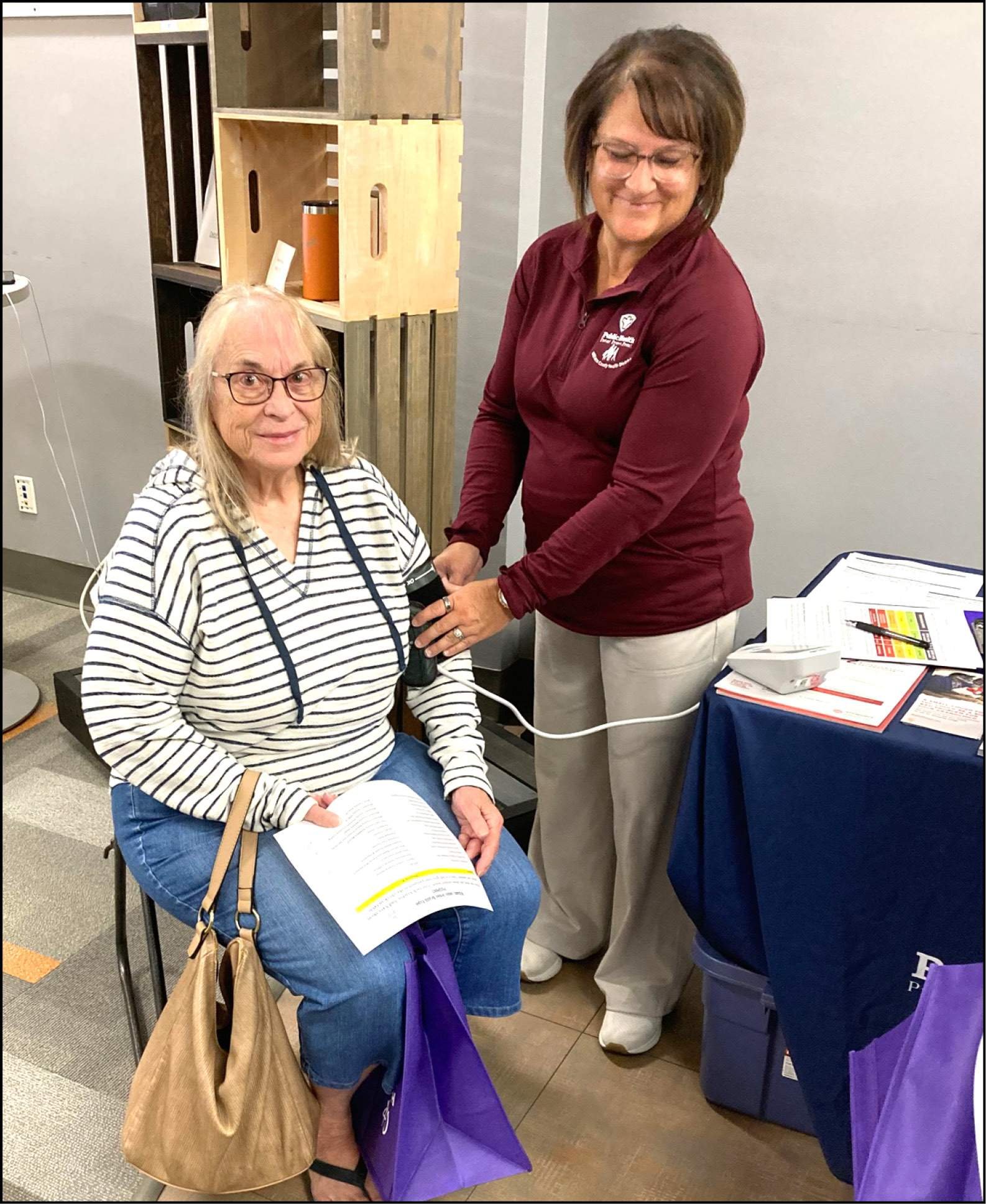 BLOOD PRESSURE CHECK … Williams County Health Department nurse Tammy Riegsecker (standing) checks the blood pressure of Pam Oberlin of Stryker (sitting) at the Williams County Senior Health Expo held Tuesday, September 30, at New Hope Community Church, Bryan.