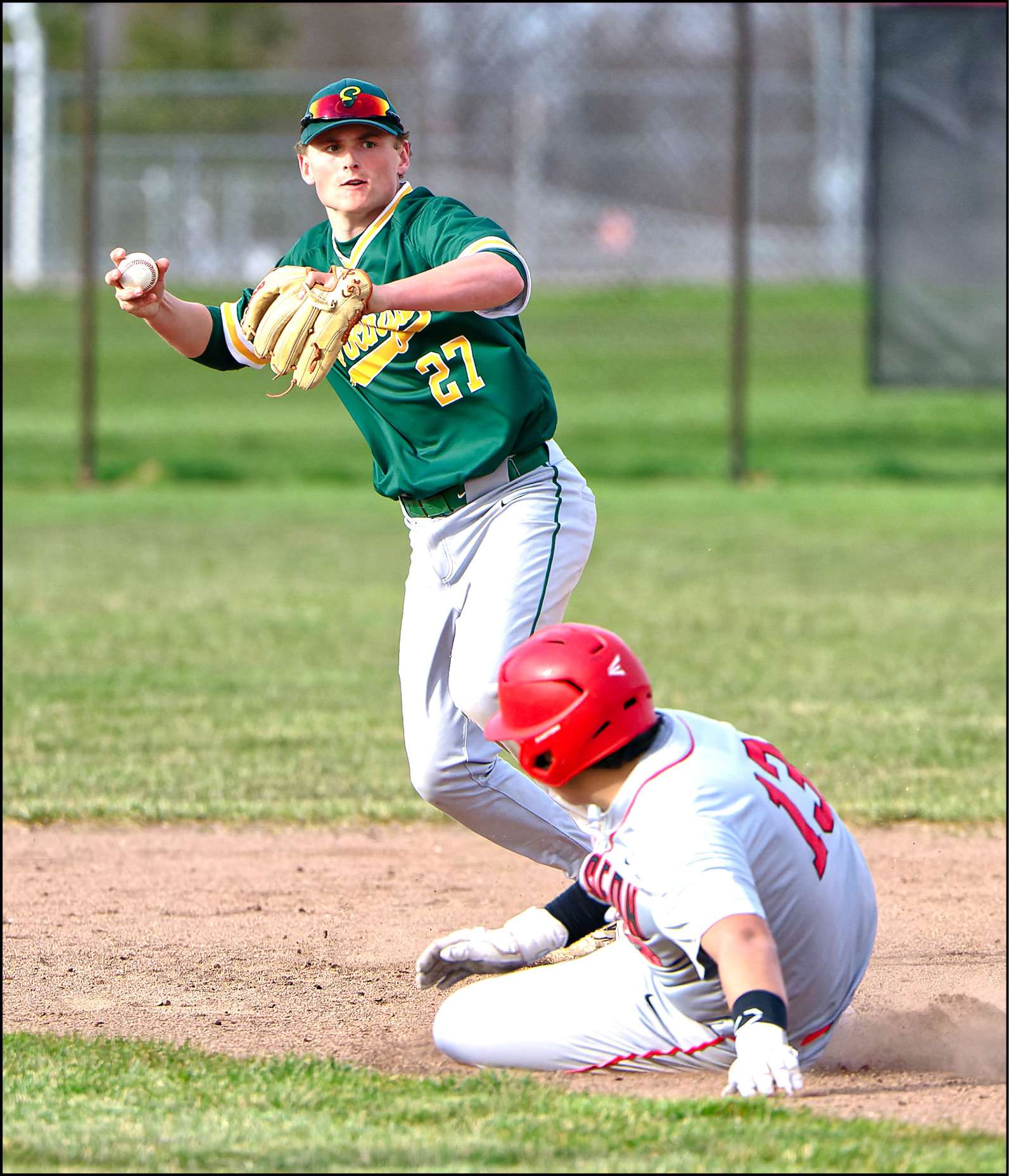 TURNING TWO … Evergreen shortstop Bryce Bolger fires to first base to complete a double play.