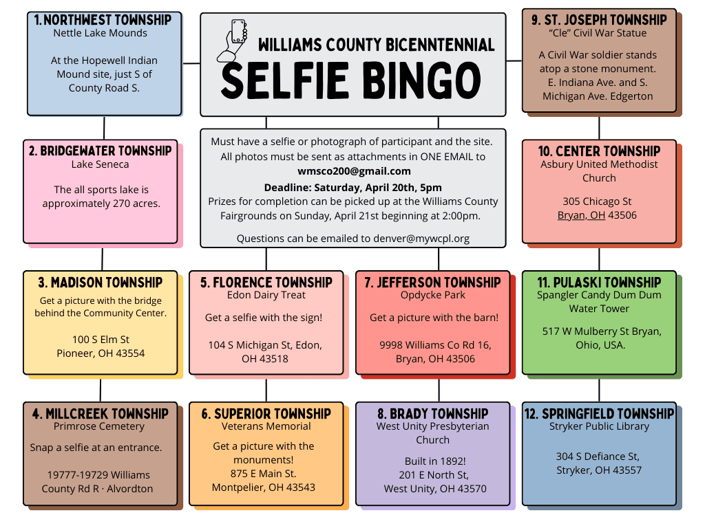 The bicentennial celebration continues with Selfie Bingo on April 20 featuring landmarks around the county. Participants are encouraged to travel around Williams County and visit every town to take a selfie with the designated town landmark.
