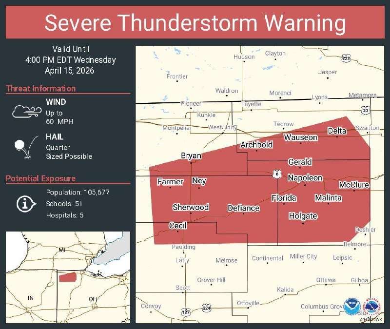 A Severe Thunderstorm Warning is in effect until 4 p.m. EDT Wednesday, April 15, 2026, for much of the Village Reporter coverage area, including Bryan, Archbold, Wauseon, Delta, Defiance, Sherwood, Napoleon, and surrounding communities.