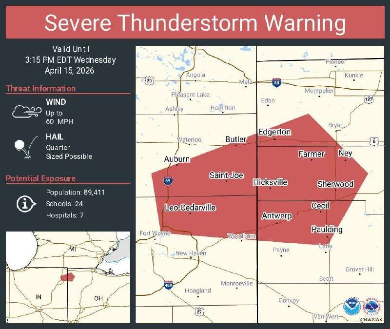 A Severe Thunderstorm Warning is in effect until 3:15 p.m. EDT Wednesday, April 15, 2026, for portions of northwest Ohio, including areas around Hicksville, Sherwood, Antwerp, Cecil, and Paulding.