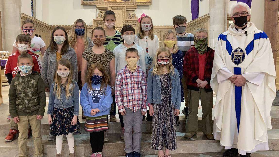 Front row: Ethan Cape, Adalynn Malcom, Adalyn Lincoln, Brycen Cape, Adley Thiel, and Father Dan Borgelt. Middle row: Hayden Anderson, Celena Krill, Clara Harris, Rosa Blalock, Nora Gerschutz, and Izzic Hobeck. Back row: Frankie Juhasz, Josie Juhasz, Morgan Cape, Addi Everetts, and Darius Mahrt.