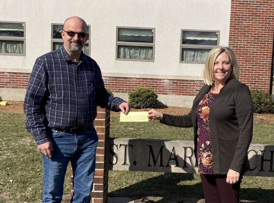 DONOATION … Mr. Scott Powell from the Blakeslee Knights of Columbus presented a $2,505 check to Mrs. Taylor, the principal at St. Mary School. This amount represents the proceeds from a recent raffle held specifically for our local Catholic school. The school is grateful for the support of our area Knights.