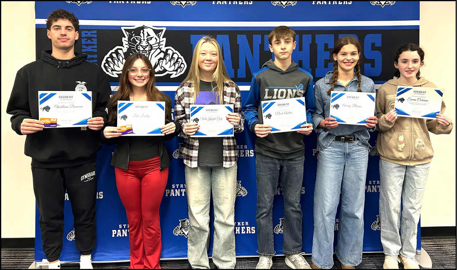 JANUARY STUDENTS … Stryker Local Schools selected their January Students of the Month. Tolerance was the character trait that these students displayed to earn this award. (L to R) William Donovan (Senior), Lola Liechty (Junior), MaKayla Guy (Sophomore), Noah Andres (Eighth Grade), Avery Blevins (Freshman) and Emma Coleman (Seventh Grade).