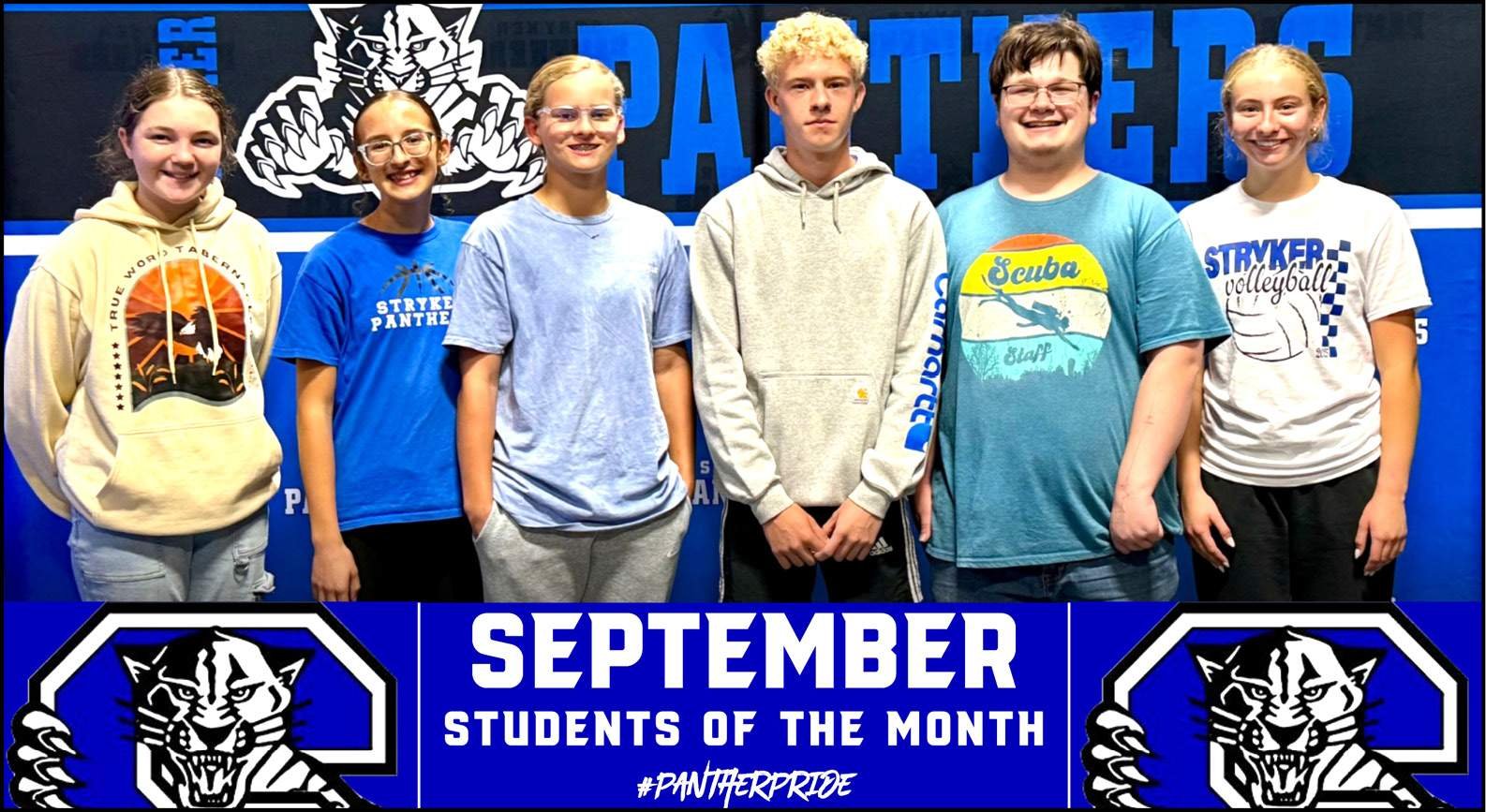SEPTEMBER HONOREES … Congratulations to the September Students of the Month at Stryker Local Schools! These students were recognized by their teachers for consistently showing the character trait of responsibility. Left to right: Allicia Frazee -7th grade, Elsie Arnos – 8th grade, Brenna Creighton – Freshman, Abram Batterson – Sophomore, Aaron Cheeseman – Junior, Reiss Creighton-Senior.