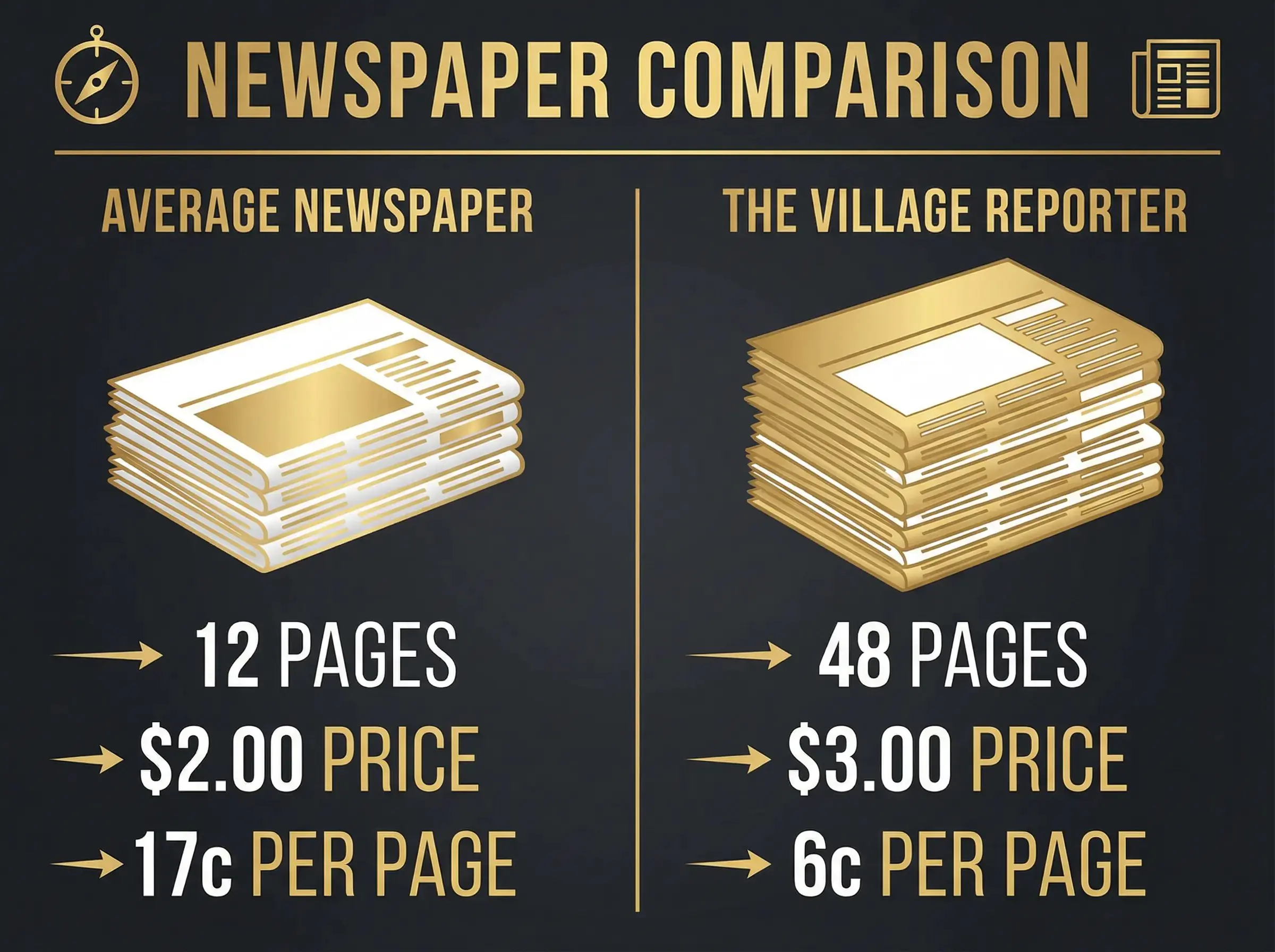 The Village Reporter will increase its single-copy price from $2.00 to $3.00, effective the February 4, 2026 edition (this week). This marks the first price change since prior to the COVID-19 pandemic and comes in response to the rising costs associated with producing a high-quality community newspaper.