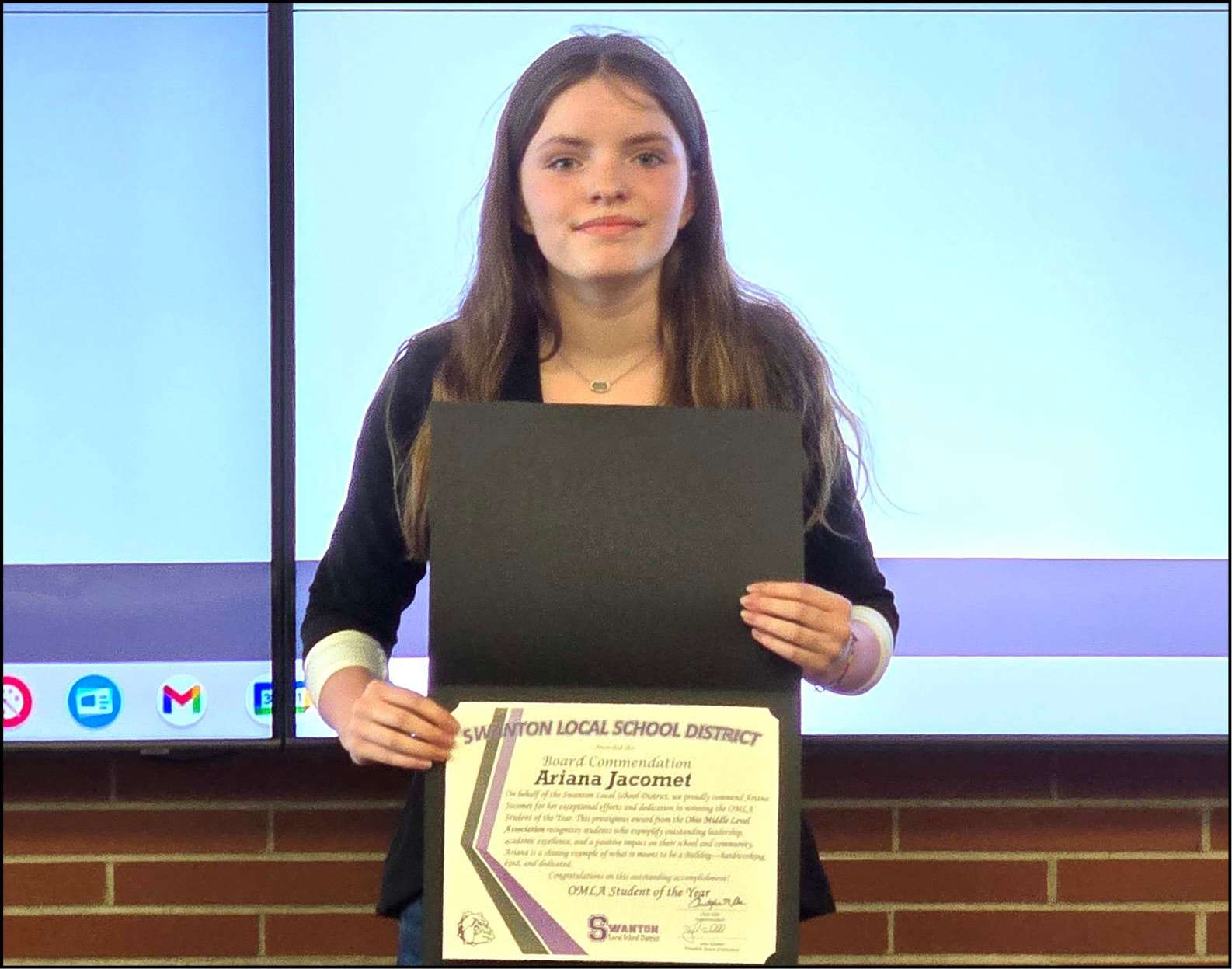 TOP OF HER CLASS … Swanton Middle School student Ariana Jacomet poses with a certificate honoring her for being recognized as the Ohio Middle Level Association’s Student of the Year for the state of Ohio. Jacomet was presented the award by eighth-grade social studies teacher Dakota Ulrich, middle school art teacher Jodie Rominski, and Middle School Assistant Principal Bailey Langenderfer.