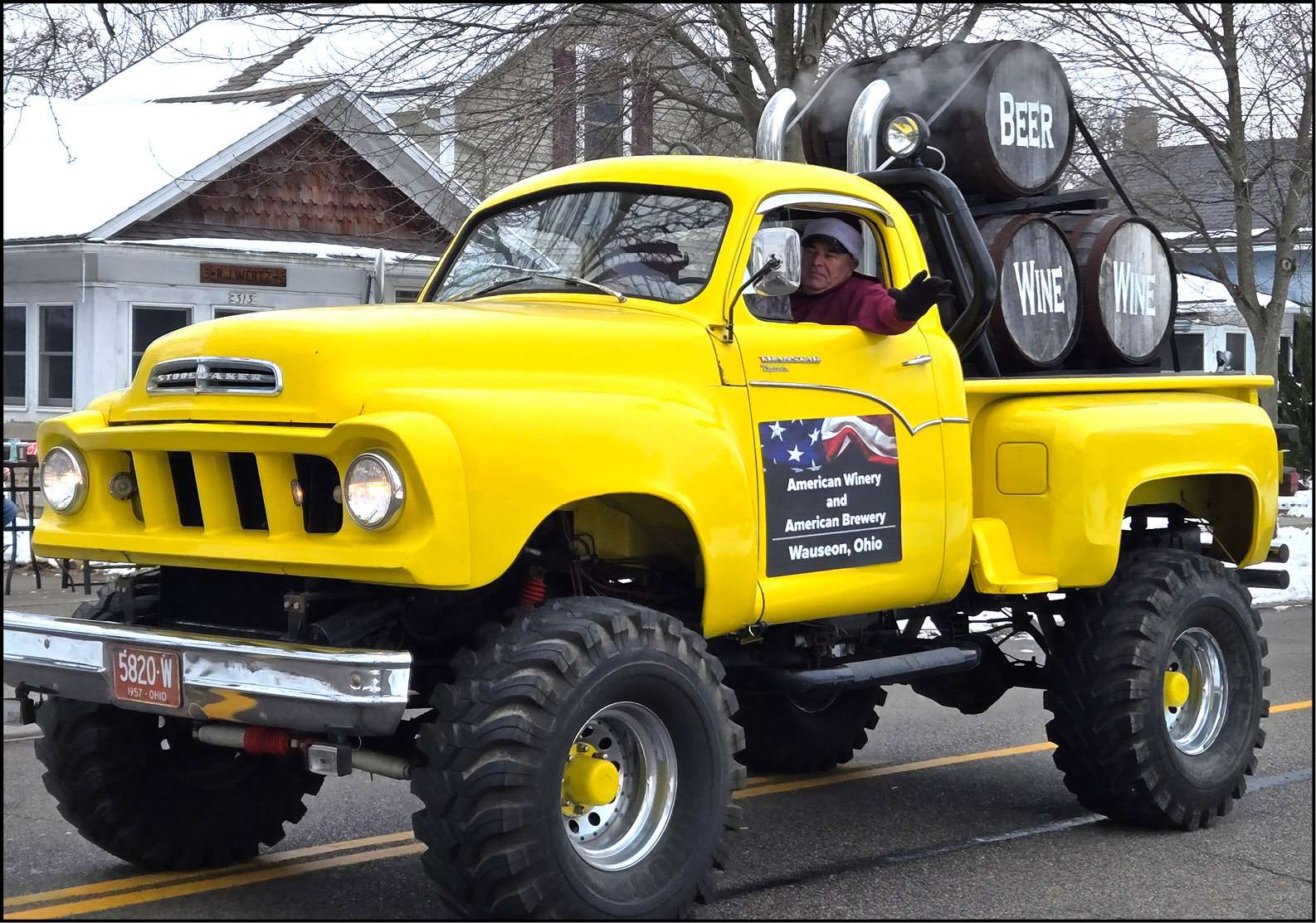 HERE WE COME A-WASSAILING … The driver of a beefed up classic pickup truck carrying faux libation barrels from the American Winery and American Brewery waves to attendees at Saturday’s Christmas parade in Swanton.