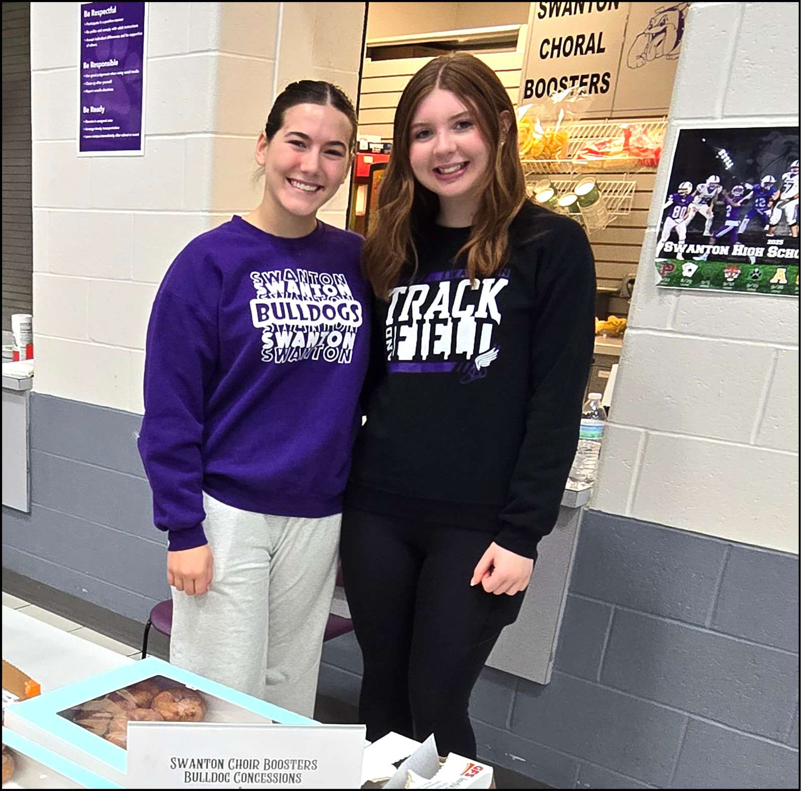 CHRISTMAS CONCESSIONS … Swanton High School sophomore Julianna Avery (left) and junior Abigail Kosier (right) sell concessions in the cafeteria during a craft fair held at the school during the Christmas in Swanton celebrations.