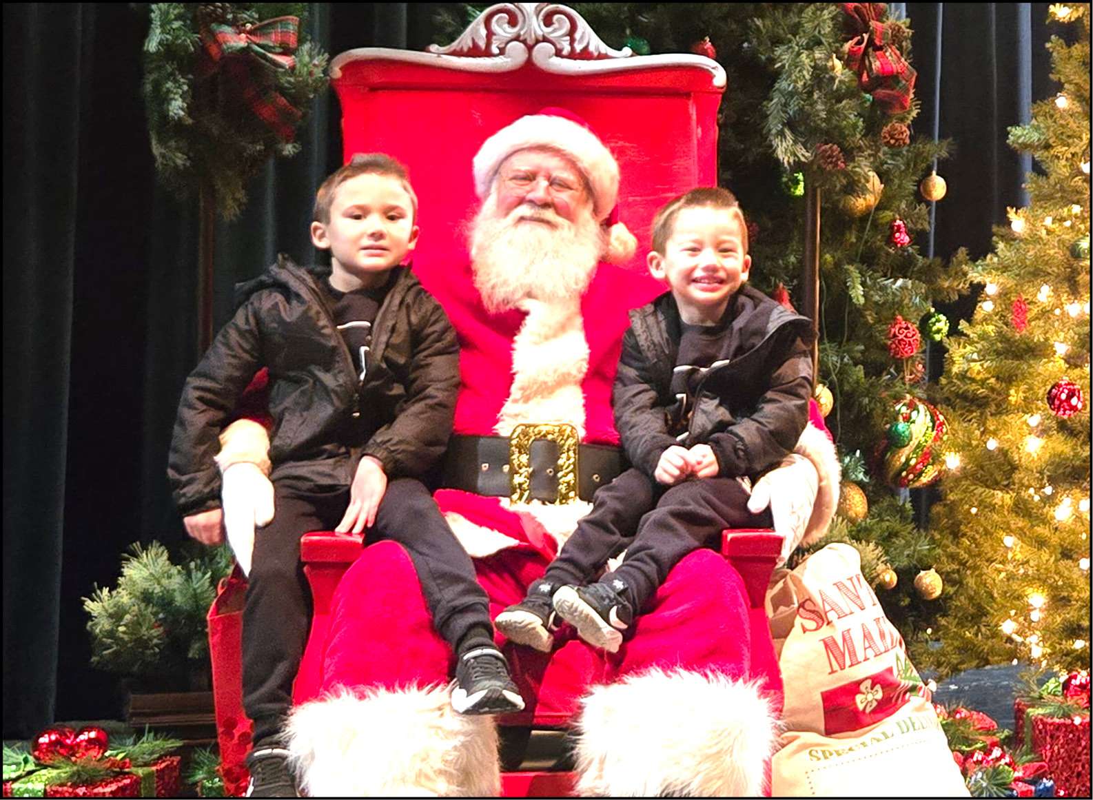 THE MAN HIMSELF … 5-year-old Kashton Stacey (left) and 3-year-old Kaden Stacey smile with Santa at Swanton High School Saturday during the annual Christmas in Swanton.