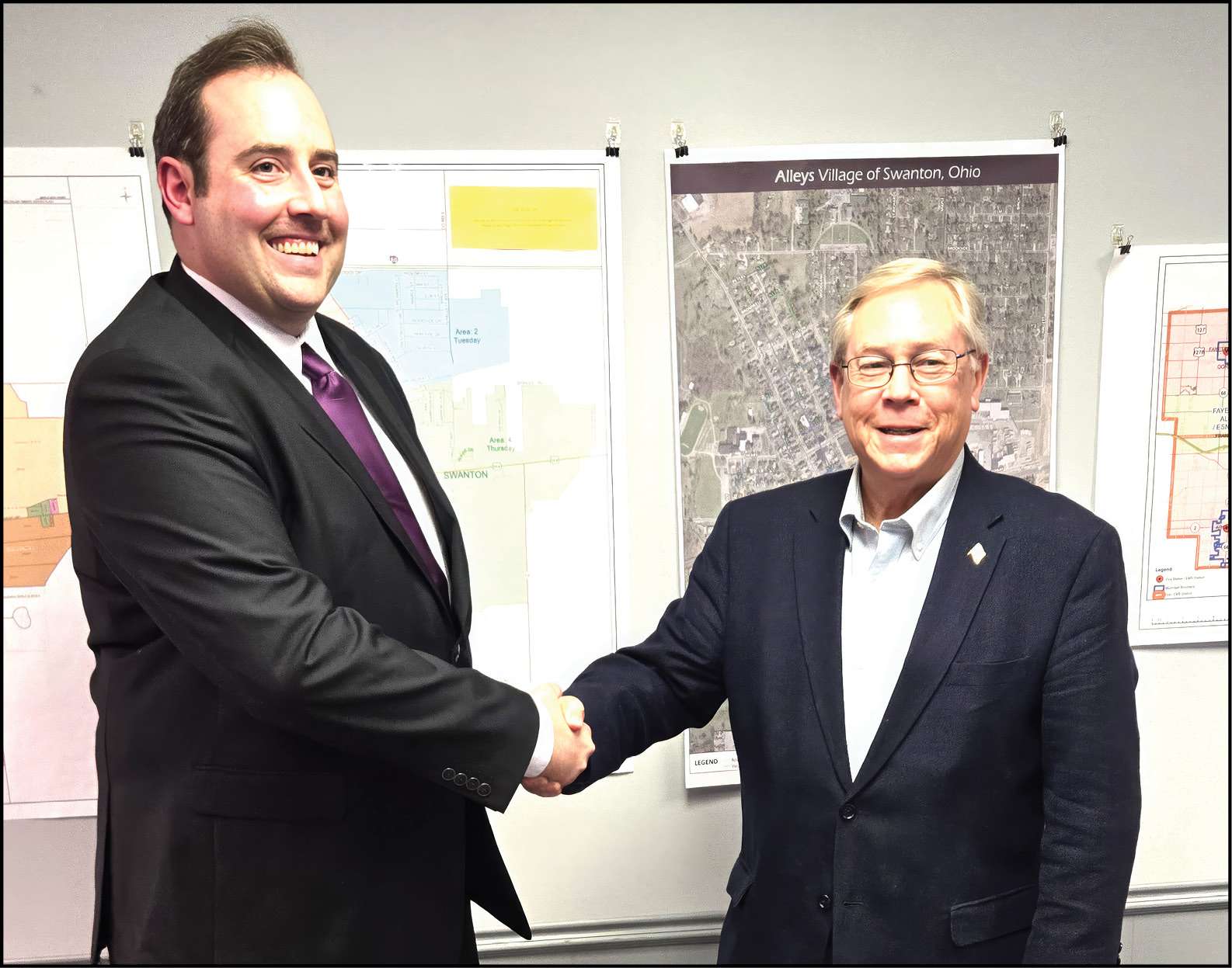 DEPUTY FIRE CHIEF RESIGNS … New Swanton Fire and Rescue District Deputy Chief Barrett Dorner stands with Mayor Neil Toeppe after the village council voted to approve his hiring during its August 12, 2024 meeting. Dorner submitted his resignation from the position on March 18.