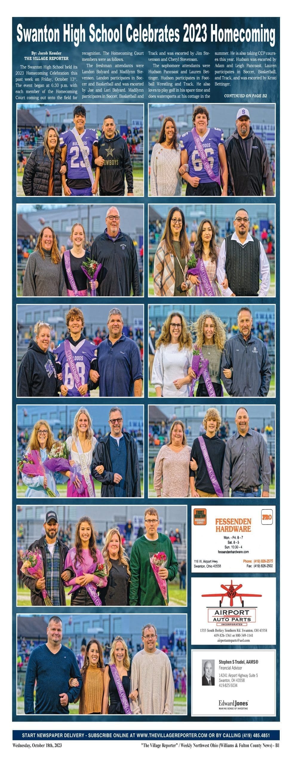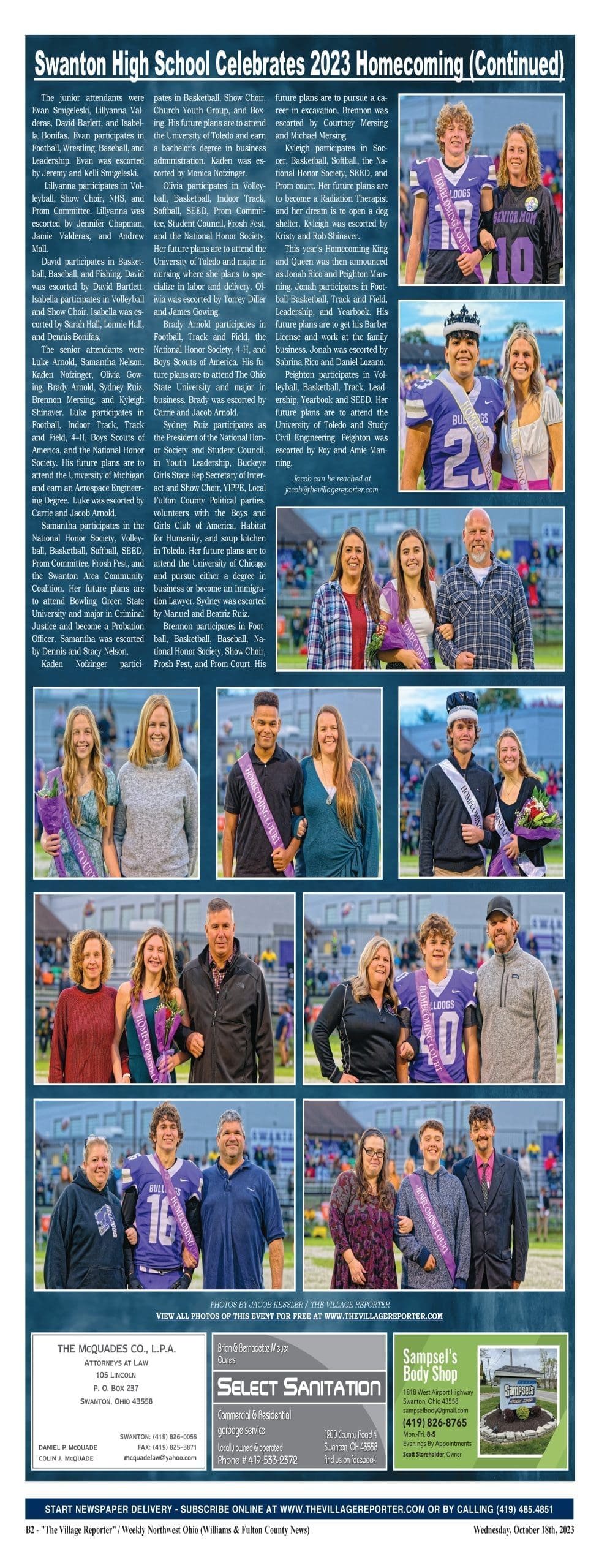 The Swanton High School held its 2023 Homecoming Celebration this past week on Friday, October 13th. The event began at 6:30 p.m. with each member of the Homecoming Court coming out onto the field for recognition. The Homecoming Court members were as follows.