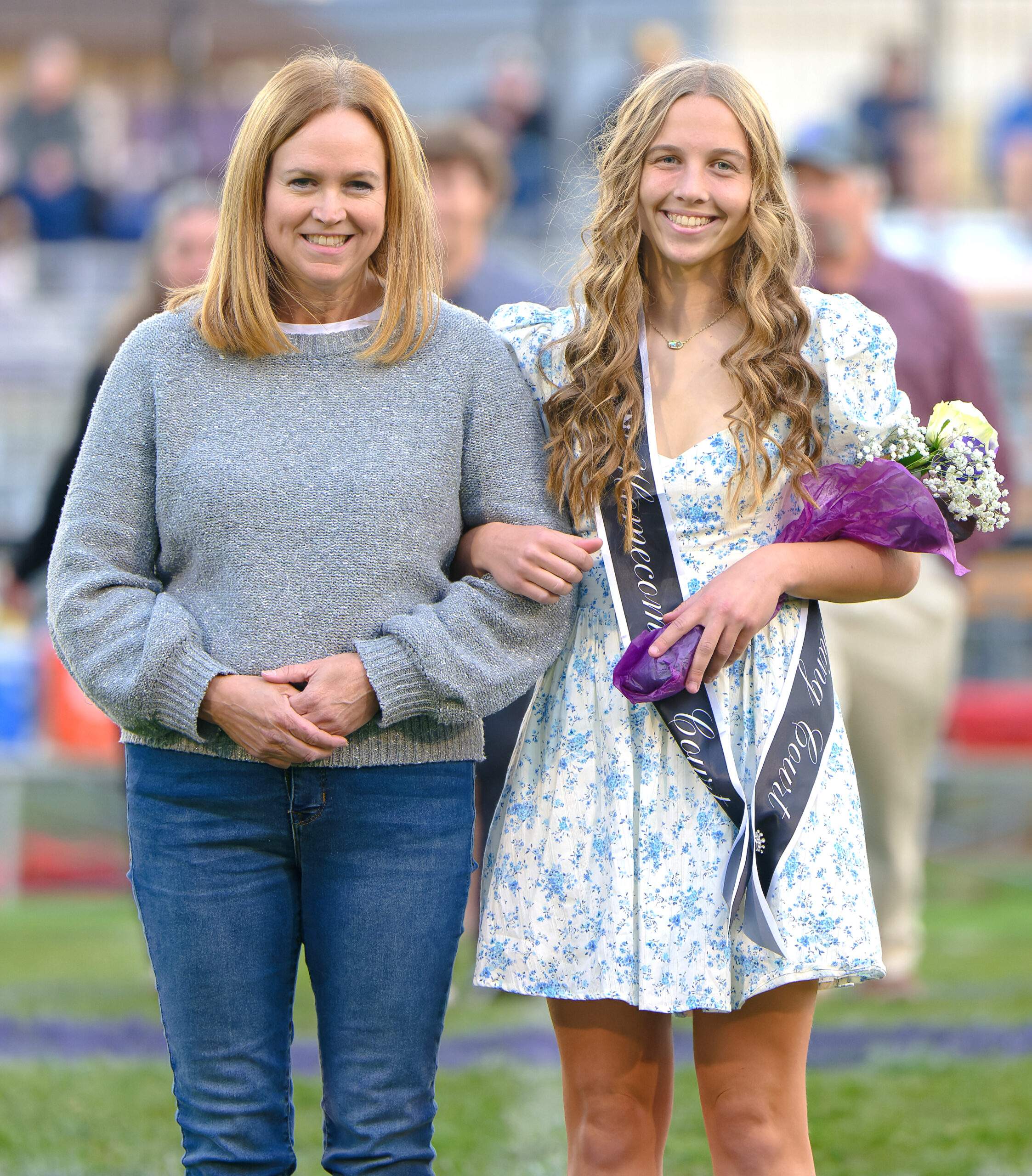 SOPHOMORE … Payton Glonek is escorted by her mother, April Glonek, as she walks onto the field during Friday night’s ceremony.