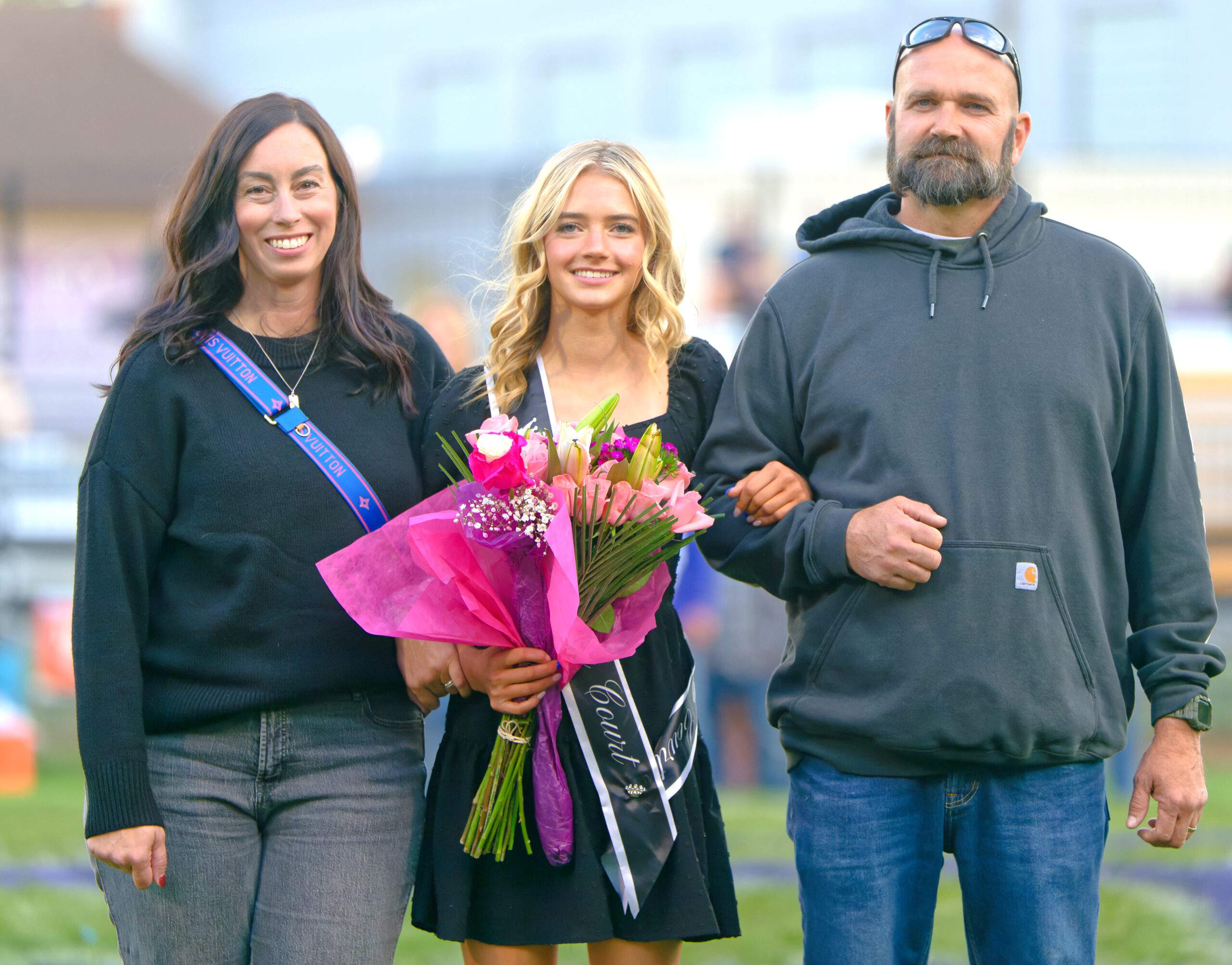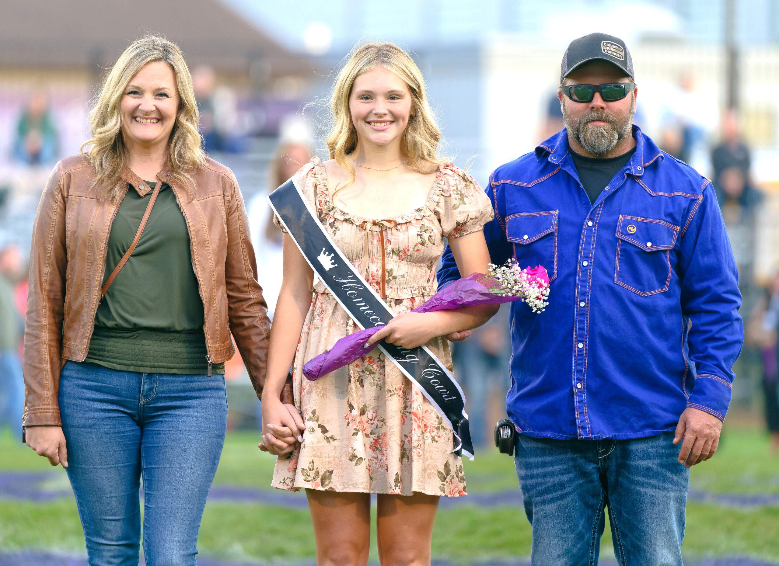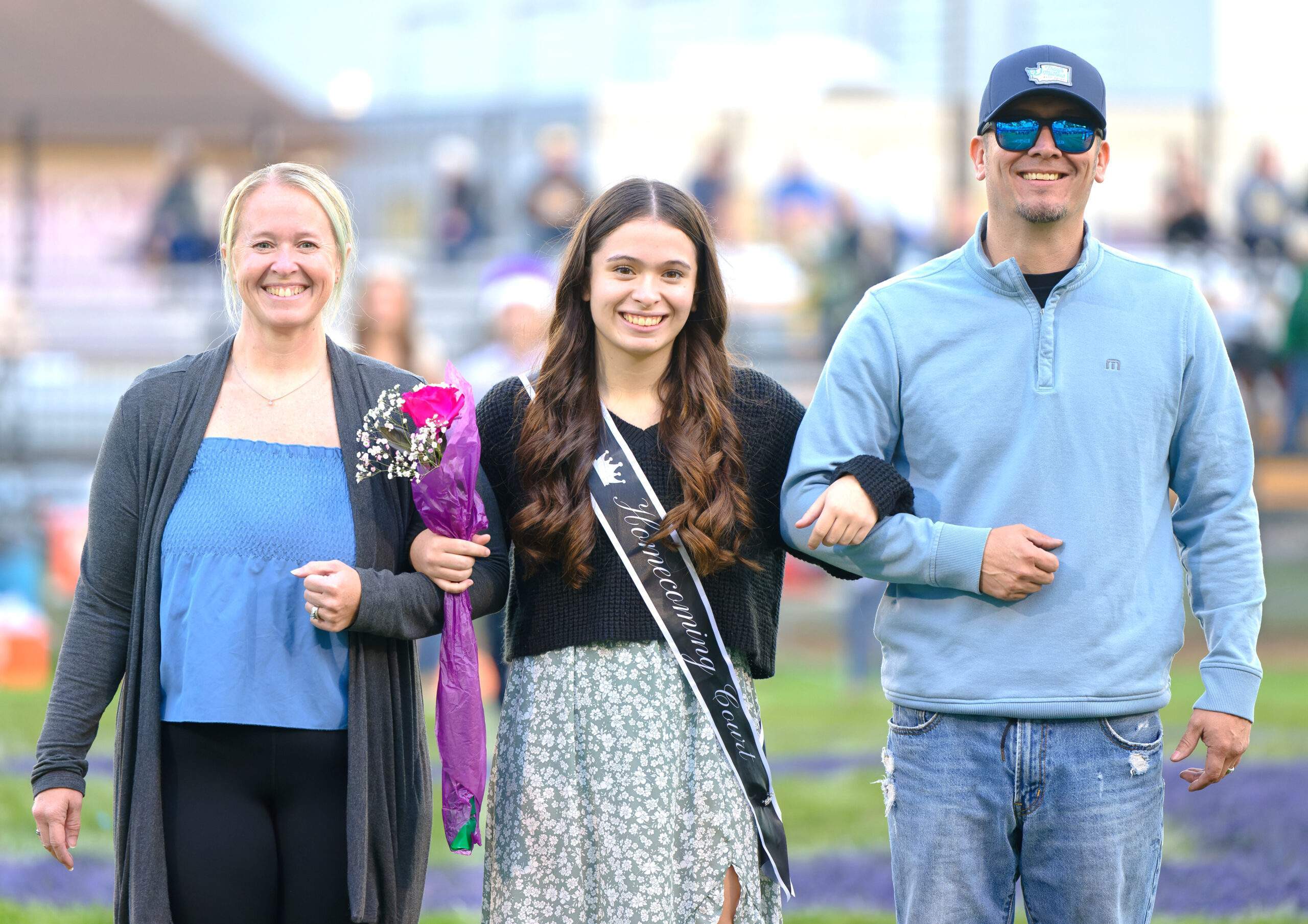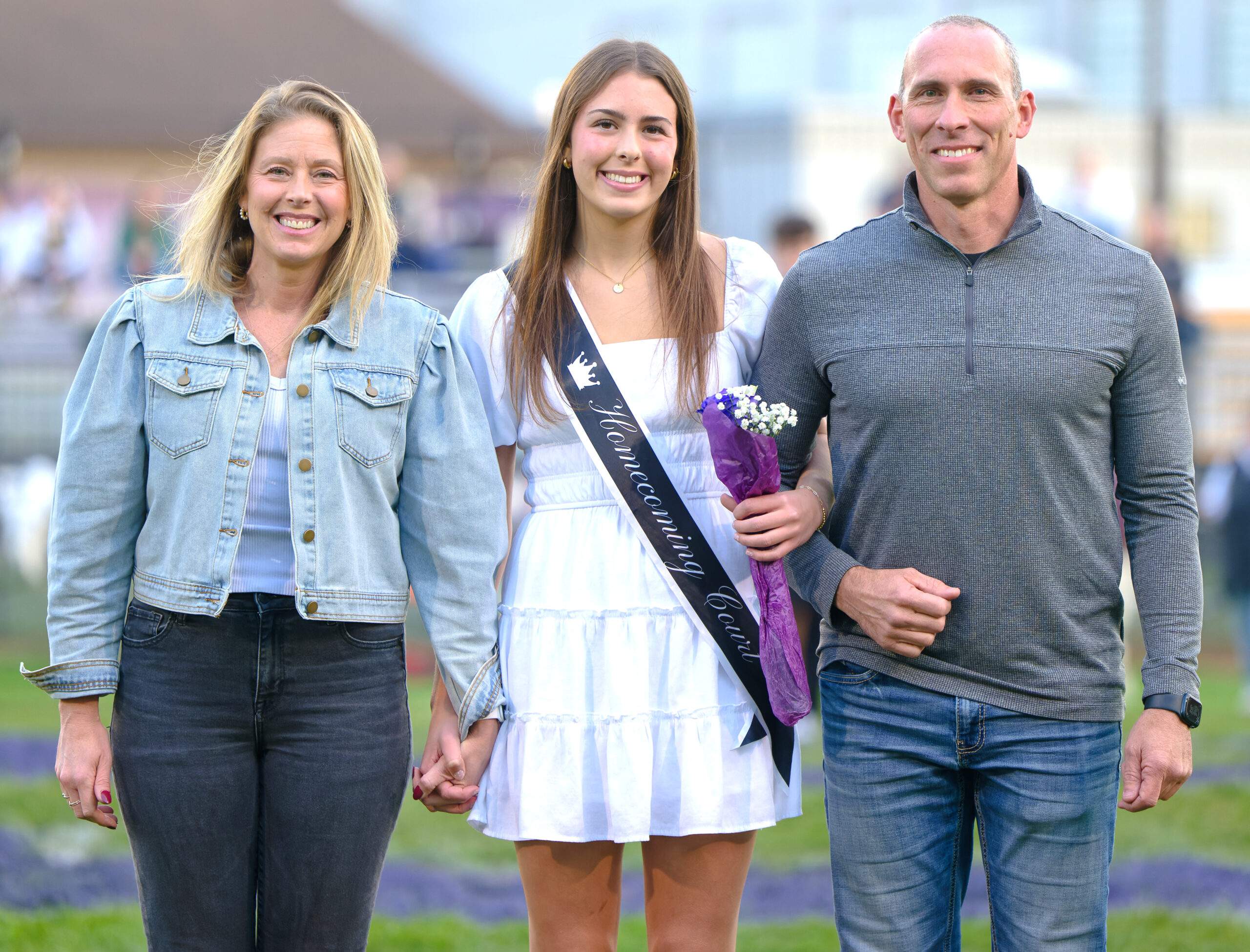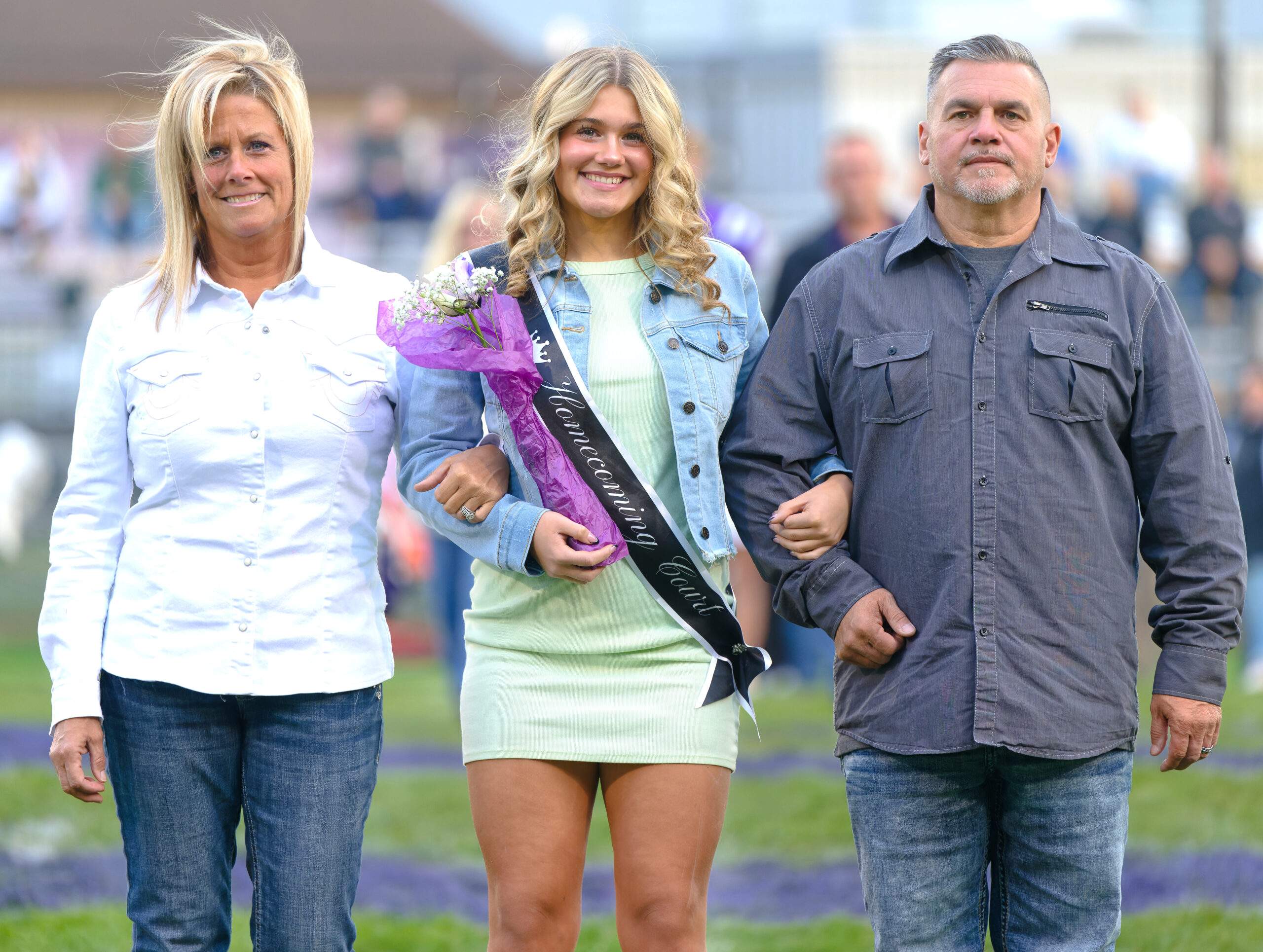 JUNIOR … Lexie Yeager walks with Jessica and Kevin Yeager during her introduction to the Homecoming crowd.