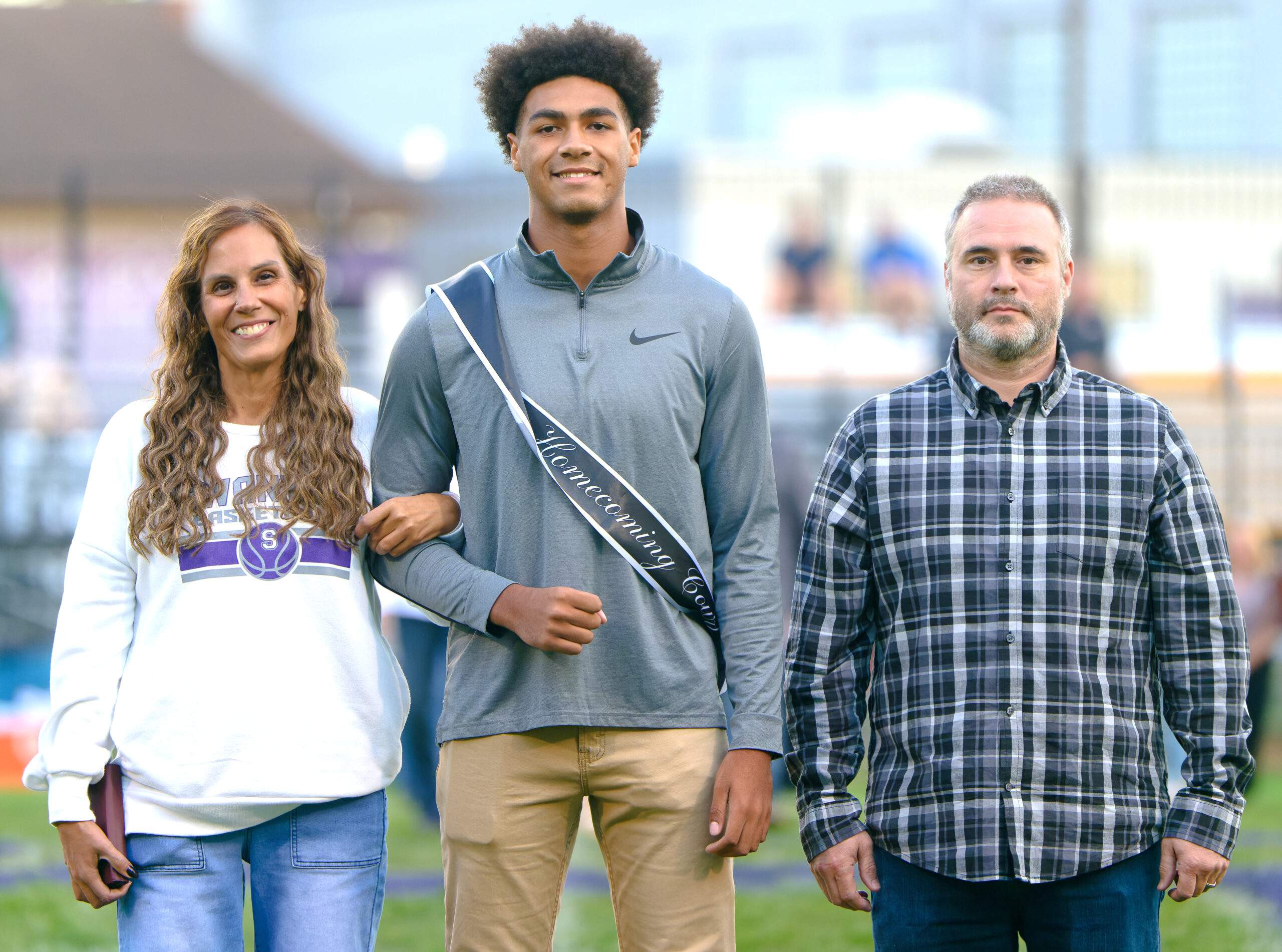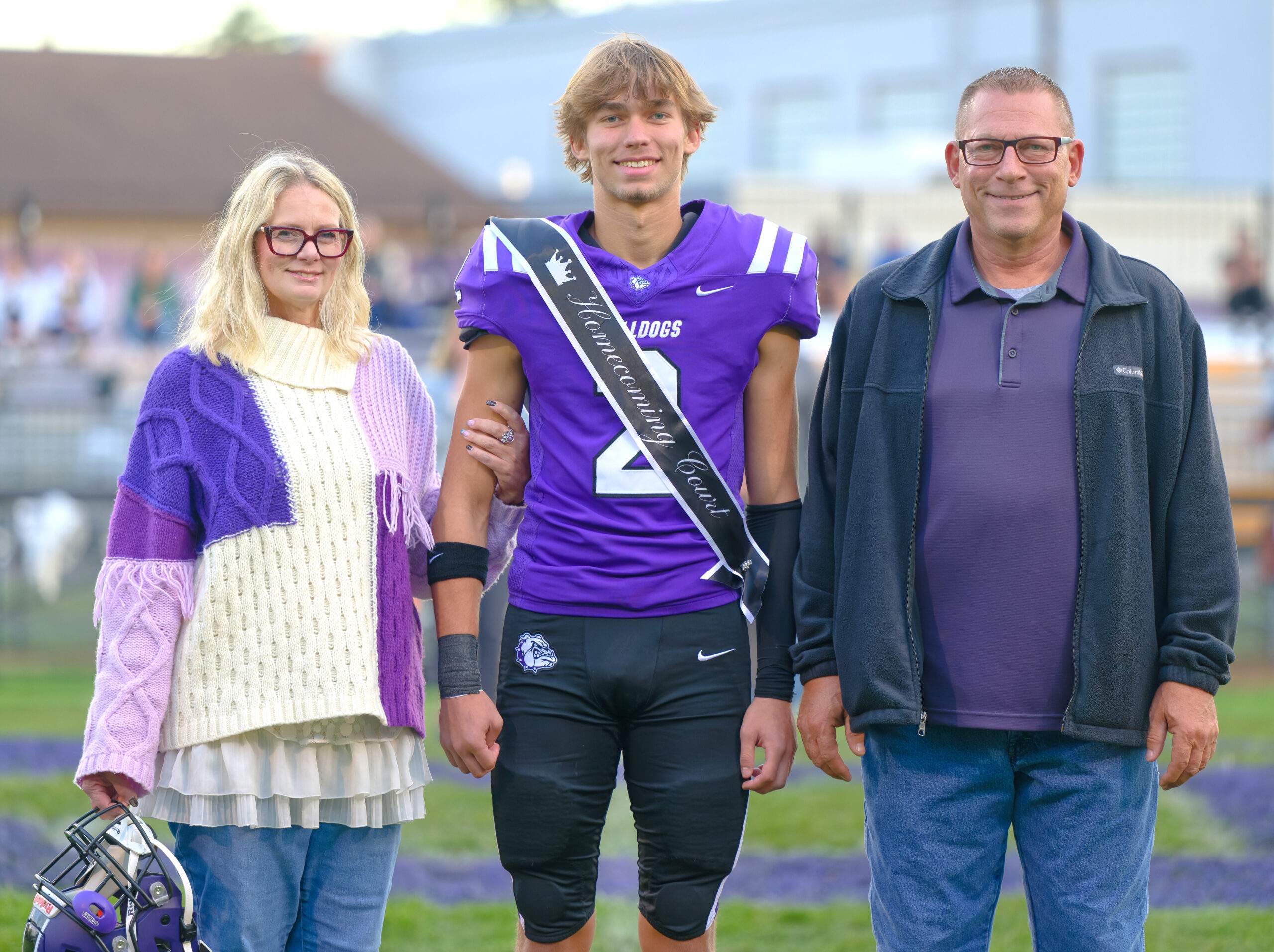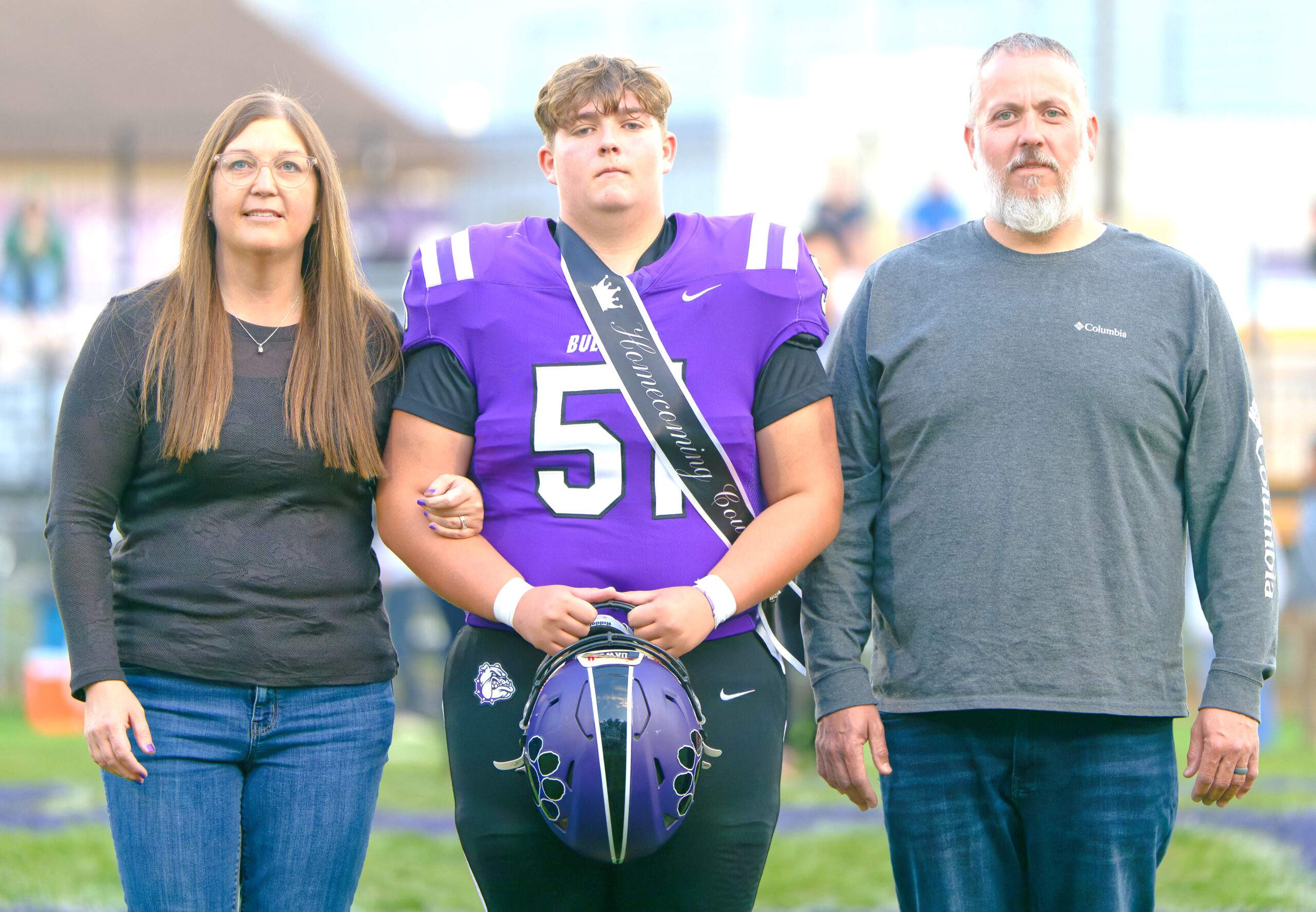 SENIOR … Brody Voight is escorted by Melanie and Rob Voight as he steps onto the field for the Homecoming ceremony.