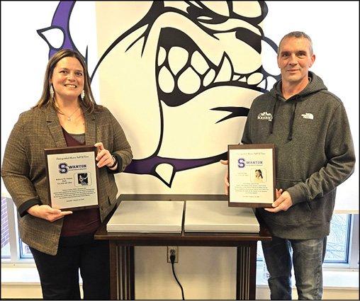 SHS DISTINGUISHED ALUMNI RECOGNIZED … University of Nebraska professor Associate Professor Dr. Rebecca Nelson (left) and Roof Ohio Owner Gene Wilson (right) stand with their plaques after being inducted into the Swanton High School Distinguished Alumni Hall of Fame on Friday.