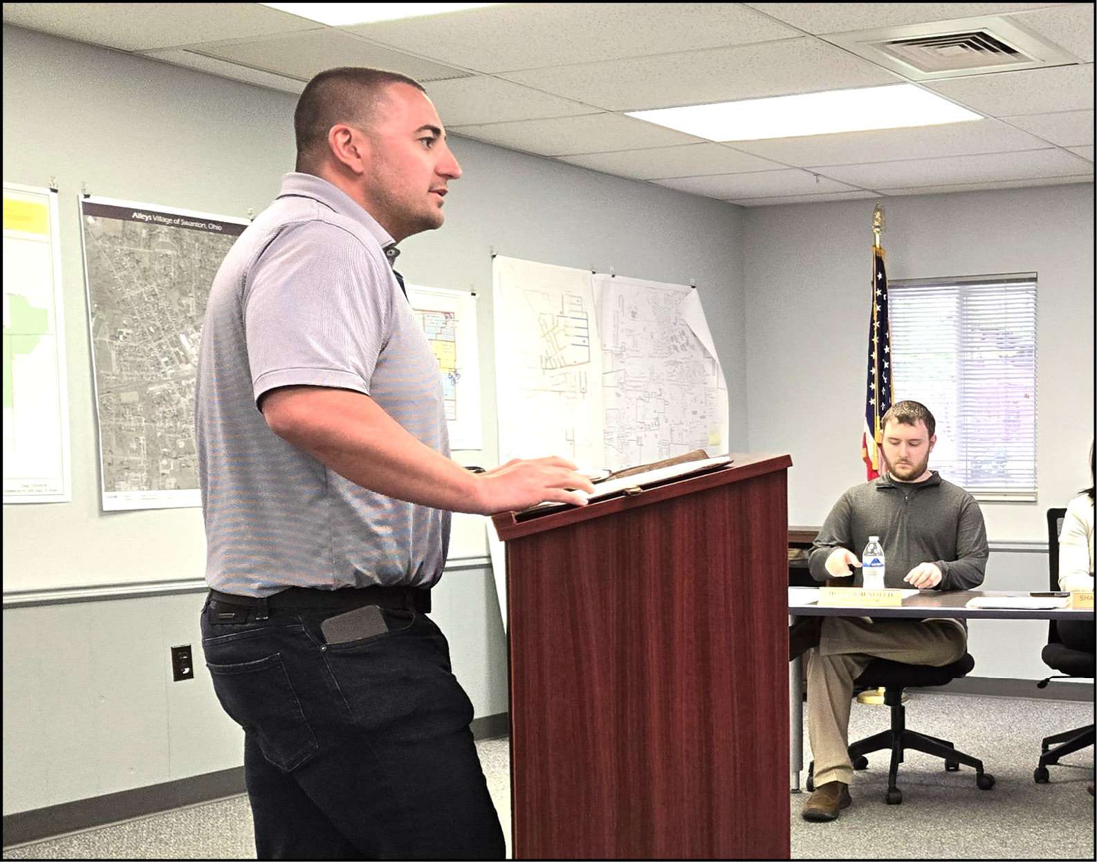 LIABILITY HOT POTATO … Greg Hillabrand of Hillabrand and Sons Construction addresses the Swanton Village Council during its meeting Monday evening. A discrepancy between council and Hillabrand regarding whether the contractor or Ohio Gas is responsible for certain property cleanup following work by both businesses in the village is now planned to be sorted out in future meetings with representatives from each as well as a project manager.