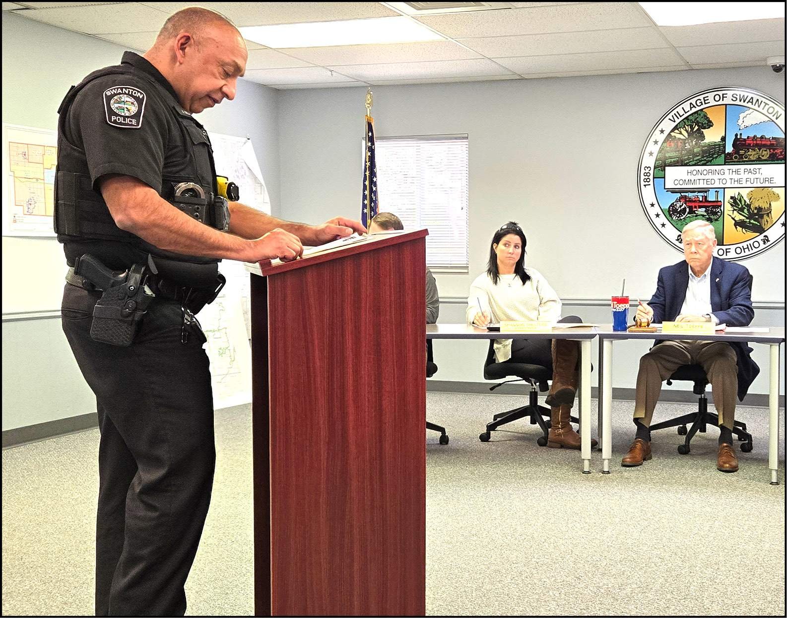 MODERN POLICING … Swanton Police Chief John Trejo delivers his report to the Swanton Village Council during their meeting Monday evening. Included in his report was that officers were notified via a Flock license plate reader camera in town of a vehicle related to a missing or endangered adult and child which resulted in the child being located and returned to their guardian.