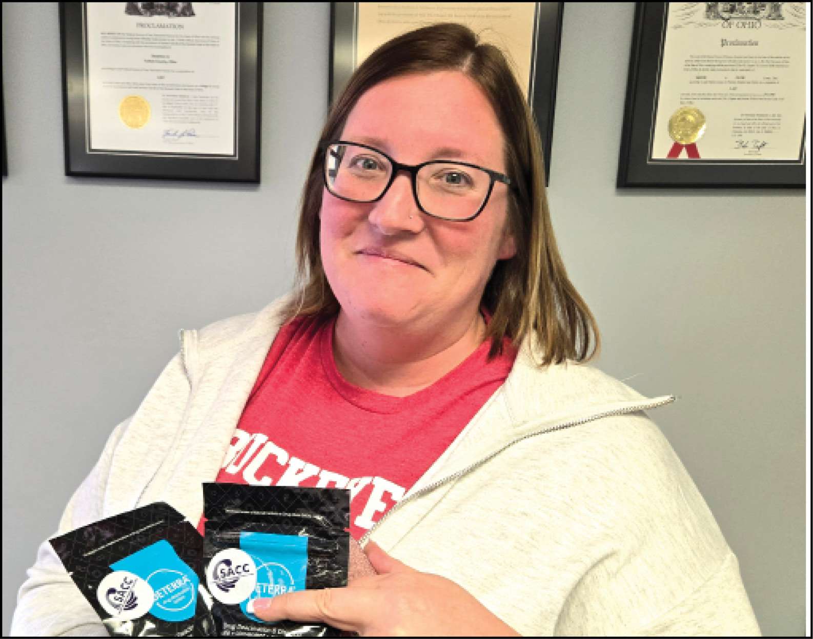 RESPONSIBLE DISPOSAL … Swanton Area Community Coalition Director Mackenzi Roytek holds several prescription drug disposal bags she distributed to members of the Swanton Village Council during their meeting Monday. According to Roytek, a drug takeback day held by SACC recently in conjunction with the police department collected more than 20 pounds of pills alone, among other medications and equipment.