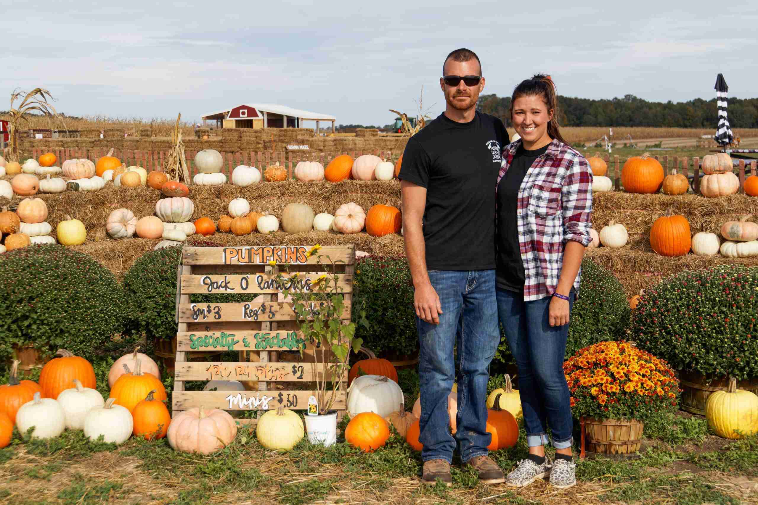 T22 FARMS … Wes and Katey Schaffner stand in front of a display of pumpkins at their T22 Farms location. The display of pumpkins and flowers greets you as you arrive at the farm. (PHOTO BY JACOB KESSLER, STAFF)