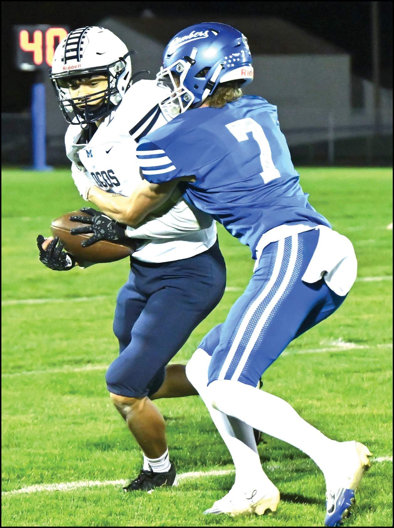 YARDS AFTER CATCH … Montpelier receiver Braylon Hopper looks for extra yards after making a catch with Edon’s Eli Dickmann (#7) going for the tackle.