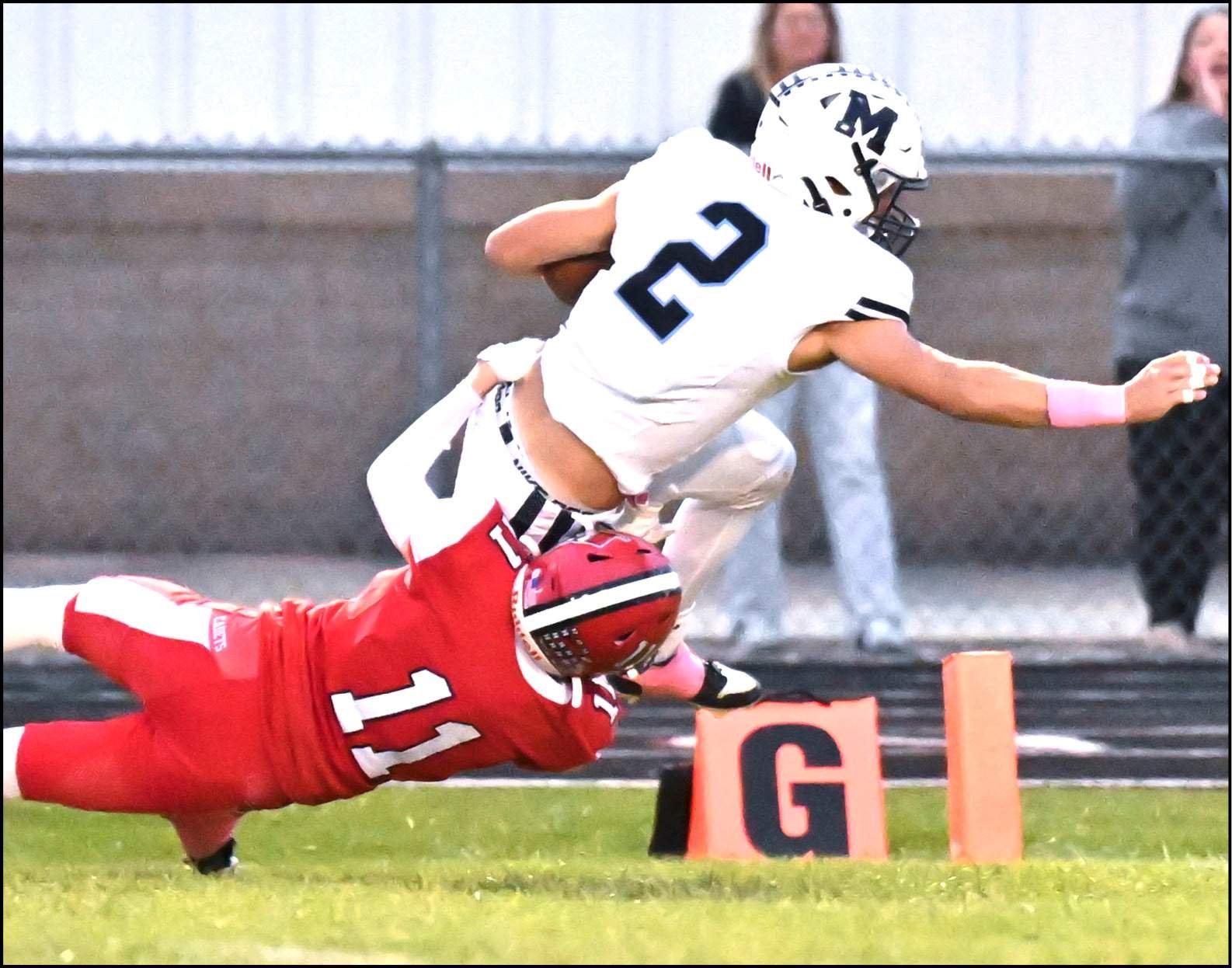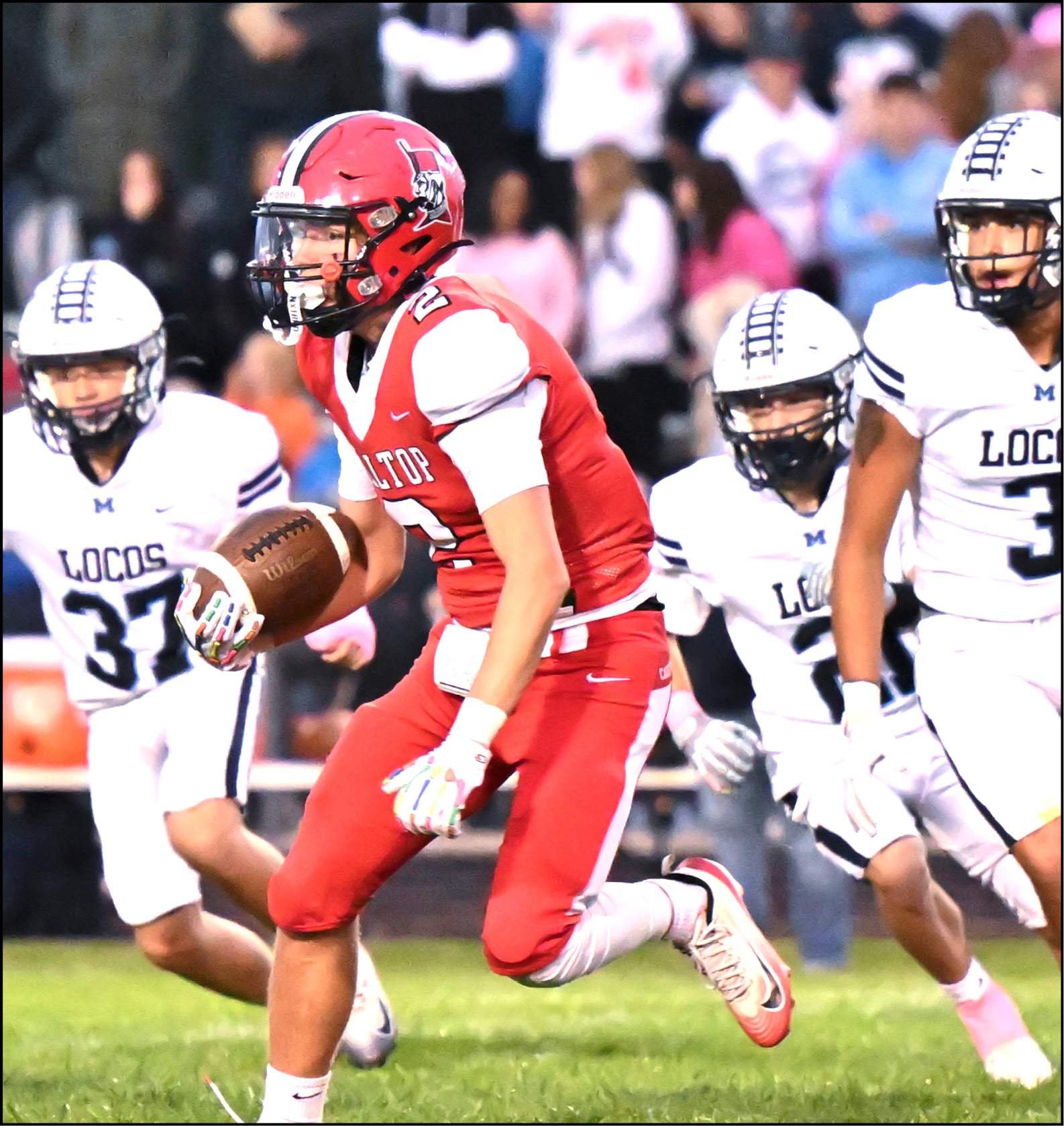 FIRST QUARTER SCORE … Griffin Cooley gets the Locos on the board with a 30-yard touchdown run as Bryson Kesler of Hilltop tries to bring him down.
