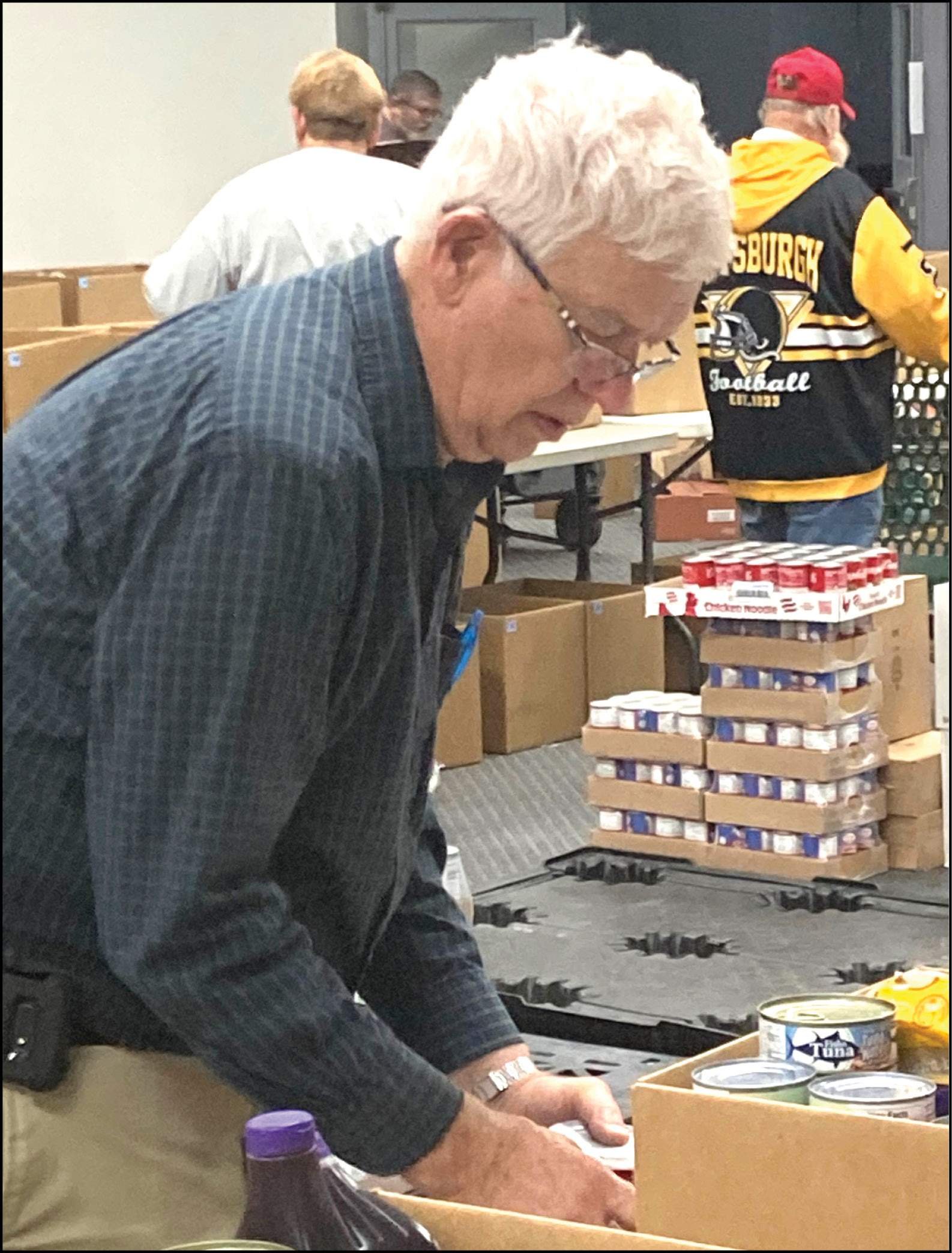 VOLUNTEER EFFORT… Sam Byroads puts canned items into a box designated for the Grace Cares Thanksgiving Food Box event at Grace Community Church on Wednesday, November 19.