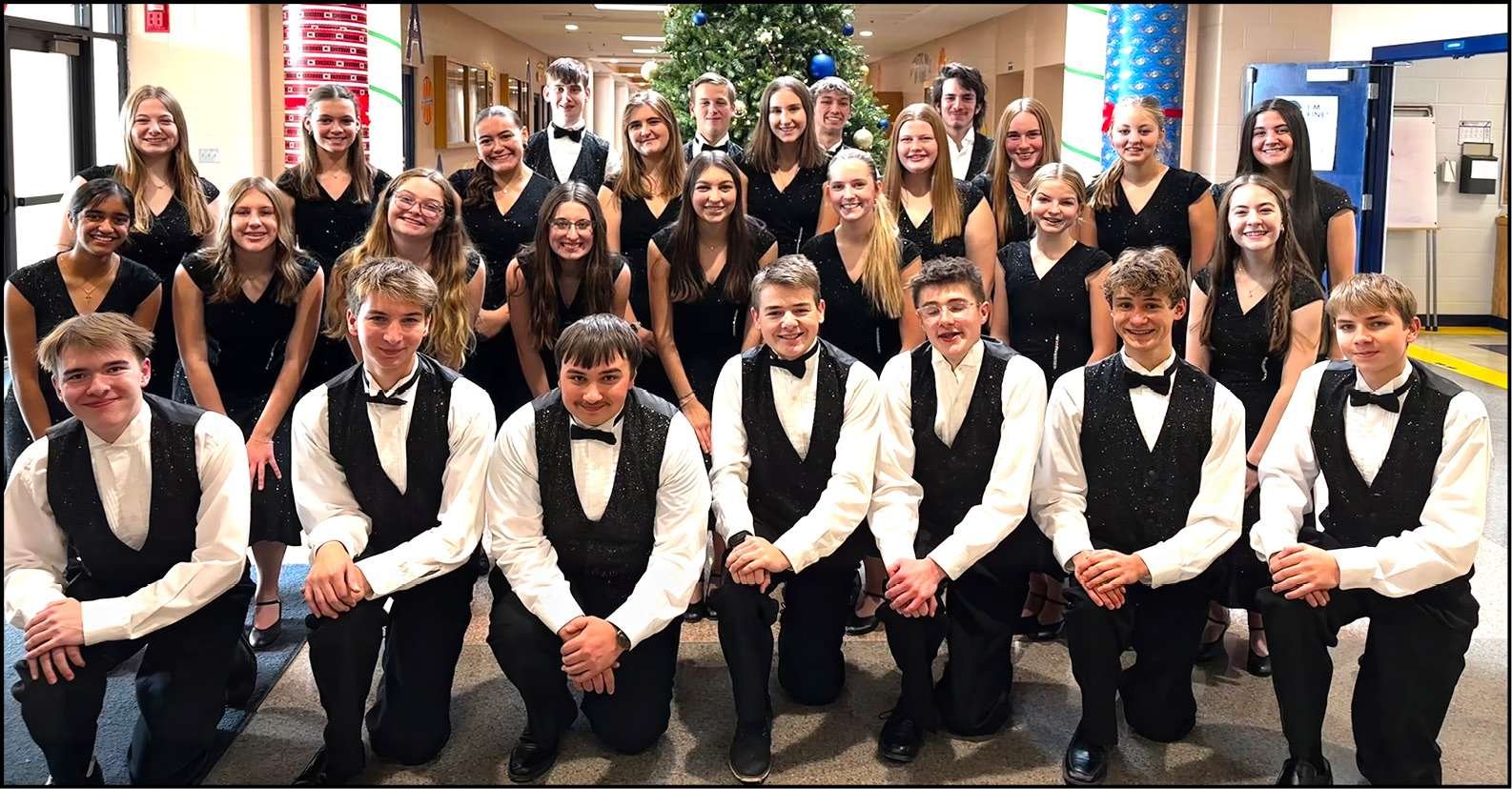 CHRISTMAS PERFORMANCE … The Company from Archbold High School entertained Archbold Rotarians and their guests at the club’s annual Christmas luncheon on December 5 at the Sauder Village 1920s theater. Members of The Company are front row from left: Braden Winegarner, Luke Ward, Gavin Miller, Matthew Barnhart, Trevor Osterland, Bo King, and Levi Ward. Middle row from left: Naomi Francis, Briella Nafziger, McKenzie Riter, Reese Bunke, Tessa Seibert, Willa Ruffer, Ginger Ruffer, and Aubree Vandock. Back row from left: Estella Martin, Ellana Nafziger, Ariah Bagrowski, Justin McCarty, Kira Murrillo, Blake Vandenberghe, Jayde Whitacre, Joel Ward, Adelynn Nafziger, Michael Funnell, Janae Murillo, Molly Rutledge, and Kennedy Kruse. The Company is directed by Courtney Grisier.